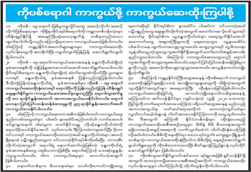 အကောက်ခွန်ဦးစီးဌာနအနေဖြင့် ကိုဗစ်-၁၉ ရောဂါ ကာကွယ်၊ ထိန်းချုပ် ကုသရေးပစ္စည်းများအား လေကြောင်း၊ ဆိပ်ကမ်း၊ နယ်စပ်ဂိတ်အသီးသီး မှ ရုံးပိတ်ရက်ရှည်ကာလအတွင်းနေ့စဉ်ရုံးပိတ်ရက်မရှိ လွယ်ကူချောမွေ့ စွာ စစ်ဆေးထုတ်ပေးလျက်ရှိရာ ၂၆-၇-၂၀၂၁ ရက်တွင် ရန်ကုန်အပြည် ပြည်ဆိုင်ရာလေဆိပ်၌ ကုမ္ပဏီ ၈ဝ မှ Oxygen Generator / Oxygen Concentrator ၃၁၈၂ ခု၊ Oximeter ၂၃၅၅၇ ခု၊ Oxygen Regulator ၁၀၃၂ ၊ Thermometer ၁၀၂၀၊ Test Kit ၅၀၀၀၊ Remdesivir