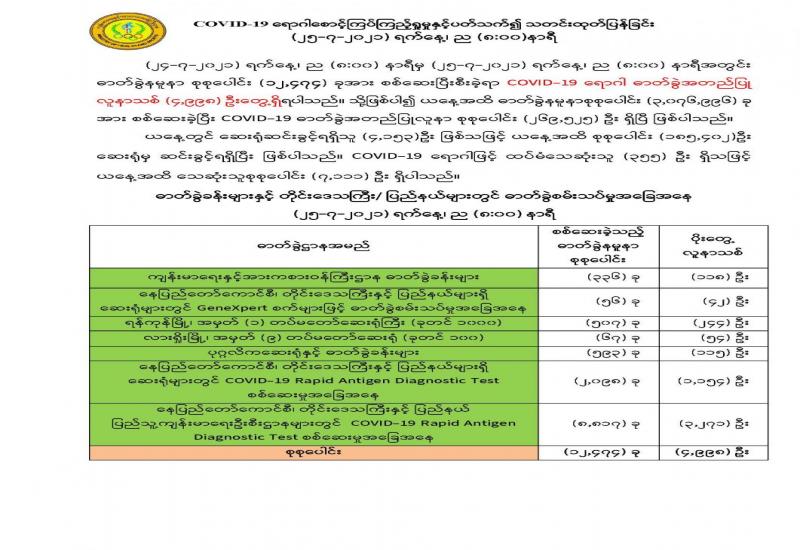 အကောက်ခွန်ဦးစီးဌာနအနေဖြင့် ကိုဗစ်-၁၉ ရောဂါ ကာကွယ်ထိန်းချုပ်၊ ကုသရေး၊ ဆေးနှင့် ဆေးပစ္စည်းများအား လေကြောင်း၊ ဆိပ်ကမ်း၊ နယ်စပ်ဂိတ်အသီးသီးမှ ရုံးပိတ်ရက်ရှည်ကာလ အတွင်း နေ့စဉ်ရုံးပိတ်ရက် မရှိလွယ်ကူချောမွေ့စွာ စစ်ဆေးထုတ်ပေးလျက်ရှိရာ ၂၅-၇-၂၀၂၁ ရက်တွင် ရန်ကုန်အပြည်ပြည်ဆိုင်ရာ လေဆိပ်၌ ကုမ္ပဏီ ၉၄ ခုမှ Oxygen Concentrator ၂၆၇၆ ခု၊ Oximeter ၂၀၉၀ ၊ Oxygen Regulator ၁၅၉၀ ၊ NILRISE FAVIPIRAVIR TABLET ၁၀၀၊ Test Kit ၄၇၂၉၃ ခု၊ NasalCannula၁၂၀ ၊ Testing Reagent ၃၃၂၀၀ ၊ Flow Meter ၄၀၀ ၊