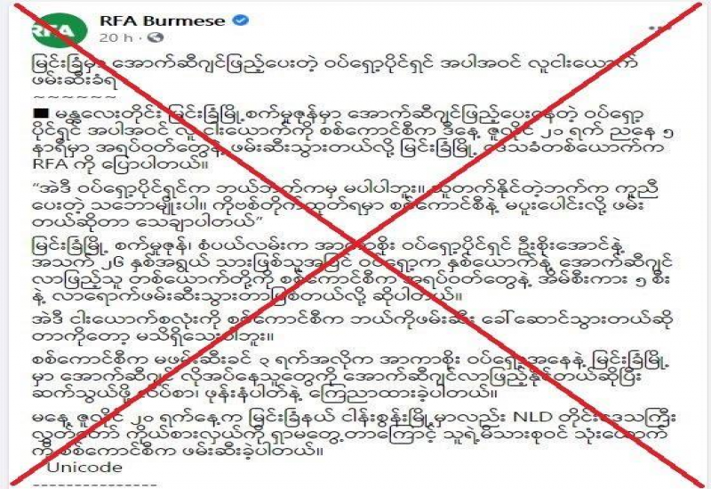 မြင်းခြံမြို့နယ် စက်မှုဇုန်ရှိ အောက်ဆီဂျင်ဖြည့်ပေးနေသော ဝပ်ရှော့ပိုင်ရှင် အပါအဝင် လူခြောက်ဦးကို လုံခြုံရေးတပ်ဖွဲ့ဝင်များက အရပ်ဝတ်များဖြင့် လာရောက်ဖမ်းဆီးသွားသည့် သတင်းအား RFA က ဖြစ်စဉ် အမှန်စိစစ်ခြင်း မရှိဘဲ ကျင့်ဝတ်မဲ့စွာ ထုတ်ပြန်ထား ကြောင်းသိရသည်။