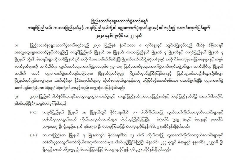 ကိုဗစ်-၁၉ ရောဂါ တတိယလှိုင်း ဖြစ်ပွားလျက်ရှိပြီး ရောဂါကူးစက်ပြန့်ပွားမှုမှာ နေ့စဉ်မြင့်တက်လျက်ရှိသောကြောင့် ရောဂါကူးစက်မှုမခံရစေရေးအတွက် နေပြည်တော်ကောင်စီ နယ်မြေ၊ ရှမ်းပြည်နယ်(မြောက်ပိုင်း)၊ လားရှိုးမြို့၊ ဧရာဝတီတိုင်းဒေသကြီး၊ ပုသိမ်မြို့နှင့် ပဲခူးတိုင်းဒေသကြီး၊ တောင်ငူမြို့များ၌