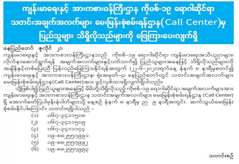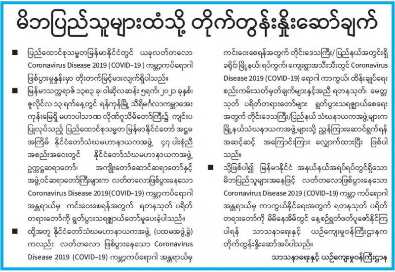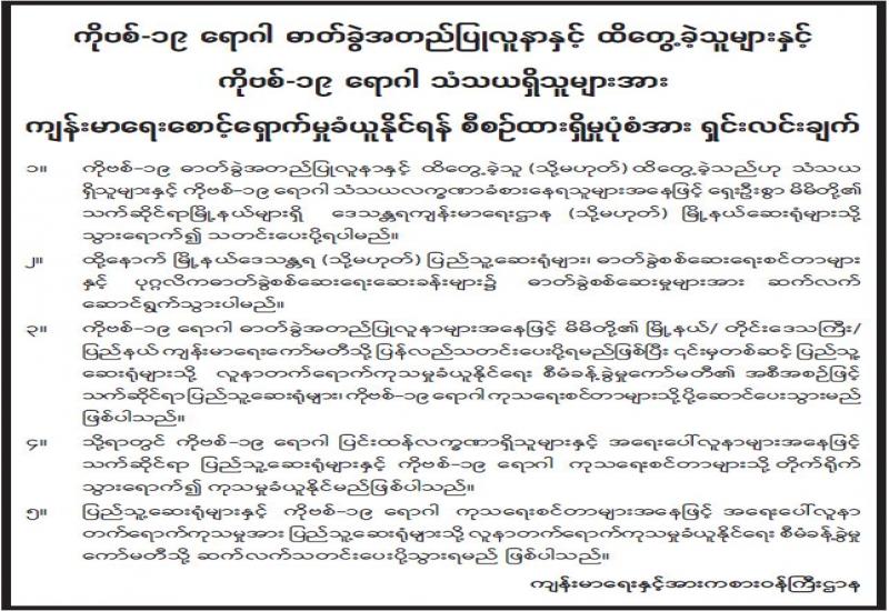 မြန်မာ့အသံနှင့် ရုပ်မြင်သံကြားမှ ဇူလိုင် ၂၀ ရက် ည ၈ နာရီ သတင်းအပြီးတွင် ထုတ်လွှင့်ပြသခဲ့သည့် ကိုဗစ် -၁၉ ရောဂါကာကွယ်ထိန်းချုပ် ရေးဆိုင်ရာဆောင်ရွက်ချက်များ အကြောင်း သိကောင်းစရာအစီအစဉ်ကို ပြည်သူများသိရှိနိုင်ရန်အတွက် ပြန်လည်ဖော်ပြလိုက်ပါသည်။