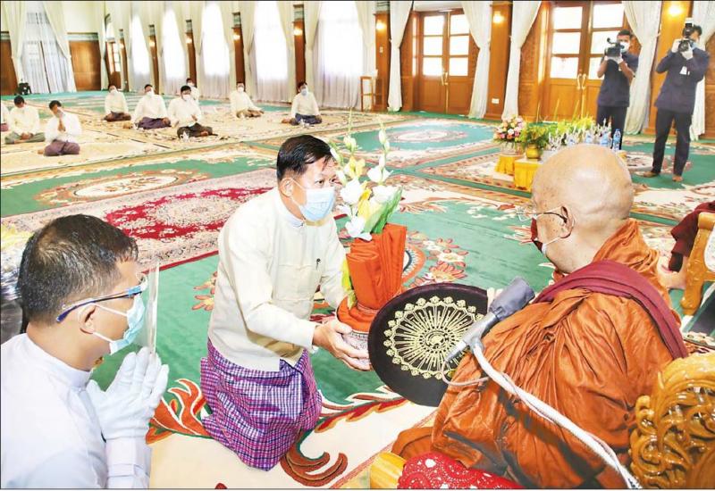 ၂၀၂၁ ခုနှစ်၊ ကာကွယ်ရေးဦးစီးချုပ်ရုံး(ကြည်း၊ ရေ၊ လေ) မိသားစုများ ဝါဆို သင်္ကန်းဆက်ကပ်လှူဒါန်းပွဲ အခမ်းအနားကို ယနေ့နံနက်ပိုင်းတွင် ကာကွယ်ရေးဦးစီး ချုပ်ရုံး(ကြည်း) အနော်ရထာခန်းမ၌ ကျင်းပပြုလုပ်ရာ နိုင်ငံတော်စီမံအုပ်ချုပ်ရေး ကောင်စီဥက္ကဋ္ဌ တပ်မတော်ကာကွယ်ရေးဦးစီးချုပ် ဗိုလ်ချုပ်မှူးကြီး မင်းအောင်လှိုင် က ဝါဆိုသင်္ကန်း၊ လှူဖွယ်ပစ္စည်းများနှင့် နေ့ဆွမ်းတို့ကို ဆက်ကပ်လှူဒါန်းသည်။