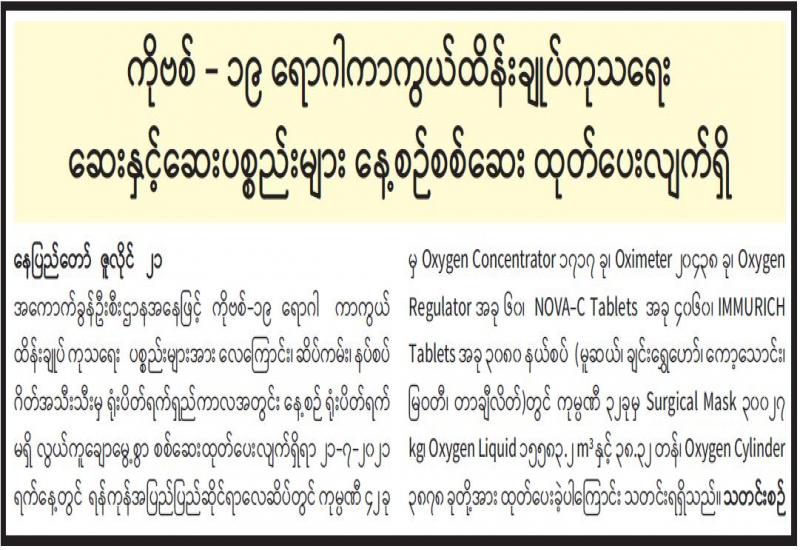 လက်ရှိအချိန်တွင် ကိုဗစ်-၁၉ ရောဂါ တတိယလှိုင်းဖြစ်ပွားမှု မြင့်တက် လျက်ရှိပြီး ဓာတ်ခွဲအတည်ပြုပိုးတွေ့လူနာများနှင့် သီးသန့်စောင့်ကြည့်ရမည့်သူများကို တပ်မတော်ဆေးရုံများ၊ ပြည်သူ့ဆေးရုံများ၊ ကျန်းမာရေးဌာနများနှင့် ကိုဗစ်စင်တာ များတွင် ကျန်းမာရေးစောင့်ရှောက်မှု လုပ်ငန်းများကို တပ်မတော်သား ဆရာဝန်များ၊ ကျန်းမာရေးဝန်ထမ်းများ၊ လူမှုရေးအသင်းအဖွဲ့များ ပူးပေါင်း၍ အင်တိုက်အားတိုက် ဆောင်ရွက်ပေးလျက်ရှိပြီး ထိုသို့ဆောင်ရွက်ပေးရာတွင် အထောက်အကူဖြစ်စေရန်အတွက် ကာကွယ်၊ ထိန်းချုပ်၊ ကုသရေးပစ္စည်းများ၊ အောက်ဆီဂျင်အိုးများနှင့် အာဟာရဖြည့်စားသောက်ဖွယ်ရာများကို တပ်မတော်က သွားရောက်ထောက်ပံ့လှူဒါန်းပေးလျက်ရှိသည်။