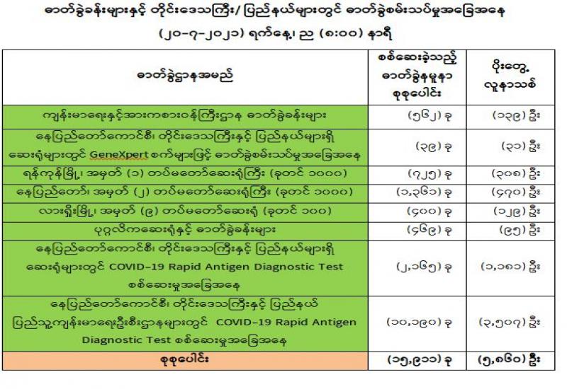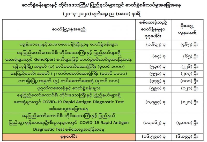 (၁၉-၇-၂၀၂၁) ရက်နေ့၊ ည (၈:၀၀) နာရီမှ (၂၀-၇-၂၀၂၁) ရက်နေ့၊ ည (၈:၀၀) နာရီအတွင်း ဓာတ်ခွဲနမူနာစုစုပေါင်း (၁၅,၉၁၁) ခုအား စစ်ဆေးပြီးစီးခဲ့ရာ COVID-19 ရောဂါ ဓာတ်ခွဲအတည်ပြု လူနာသစ် (၅,၈၆၀)ဦး တွေ့ရှိရပါသည်။သို့ဖြစ်ပါ၍ ယနေ့အထိ ဓာတ်ခွဲနမူနာစုစုပေါင်း (၃,၀၀၁,၈၃၃)ခု အား စစ်ဆေးခဲ့ပြီး COVID-19 ဓာတ်ခွဲအတည်ပြုလူနာ စုစုပေါင်း (၂၄၀,၅၇၀) ဦး ရှိပြီ ဖြစ်ပါသည်။