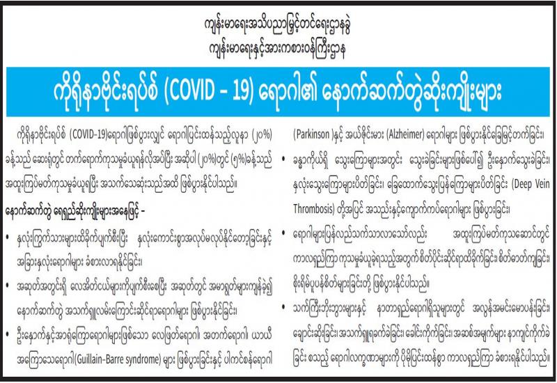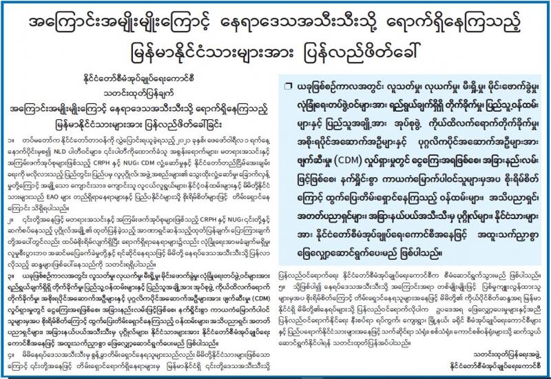 “ကျန်းမာရေးဝန်ထမ်းတွေနဲ့ ပတ်သက်ပြီးတော့ လက်ရှိနိုင်ငံရေးအခြေအနေအရ တချို့နေရာတွေမှာ အခက်အခဲရှိတာကို ကျွန်တော်တို့ တွေ့ရပါတယ်။ အဲဒီတော့ ဘာပဲပြောပြော ဖြန့်လို့ရတဲ့သူတွေကို ကျွန်တော်တို့က Distribution ပြန်လုပ်မှာပေါ့။ များတဲ့နေရာကနေပြီးတော့ နည်းတဲ့နေရာကို မရှိတဲ့နေရာကို သွားဖို့တစ်ခုရှိမယ်။ နောက်တစ်ခုက အဲဒီလိုမှမရဘူးဆိုရင် ကျွန်တော်တို့က ဆရာဝန်တွေကို ကန်ထရိုက်စနစ်နဲ့ ခန့်ထားဖို့လည်း စီမံပေးထားတာ၊ မှာထားတာရှိပါတယ်။ ဒါလည်း ဆက်လက်အကောင်အထည်ဖော်ဖို့ လိုပါလိမ့်မယ်။ တပ်မတော်က နေပြီးတော့၊ ပြီးတော့ ခုနက Distribution ဆိုတဲ့ နေရာမှာလည်း တပ်မတော်ဘက်က သူတွေလည်း ပါပါတယ်။ ကျွန်တော်တို့လည်း အကုန်လုံးမျှပြီးတော့ ပေးသွားမှာပါ။ အကုန်လုံး စုပြုပြီးတော့ တပ်မတော်ဆေးရုံမှာပဲ cover လုပ်နေလို့လည်း မရပါဘူး။ ဒါဟာ တိုင်းပြည်ရဲ့ အမျိုးသားရေး ဖြစ်ပါတယ်” ဟု နိုင်ငံတော်စီမံအုပ်ချုပ်ရေး ကောင်စီဥက္ကဋ္ဌက ဇူလိုင်လ ၉ ရက်နေ့က ပြောကြားခဲ့သည်။