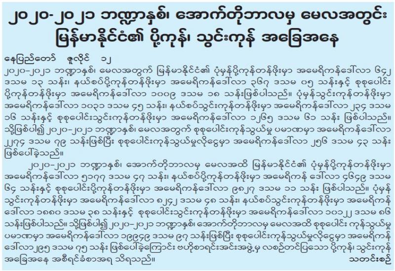 (၁၁-၇-၂၀၂၁) ရက်နေ့၊ ည (၈:၀၀) နာရီမှ (၁၂-၇-၂၀၂၁) ရက်နေ့၊ ည (၈:၀၀) နာရီအတွင်း ဓာတ်ခွဲနမူနာစုစုပေါင်း (၁၄,၄၃၂) ခုအား စစ်ဆေးပြီးစီးခဲ့ရာ COVID-19 ရောဂါ ဓာတ်ခွဲအတည်ပြု လူနာသစ် (၅,၀၁၄) ဦး တွေ့ရှိရပါသည်။ သို့ဖြစ်ပါ၍ ယနေ့အထိ ဓာတ်ခွဲနမူနာ စုစုပေါင်း (၂,၈၈၁,၂၄၆) ခု အား စစ်ဆေးခဲ့ပြီး COVID-19 ဓာတ်ခွဲအတည်ပြုလူနာ စုစုပေါင်း (၁၉၇,၂၂၇) ဦး ရှိပြီ ဖြစ်ပါသည်။