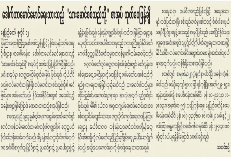 ပြန်ကြားရေးဝန်ကြီးဌာန၏ လမ်းညွှန်မှုဖြင့် ပုံနှိပ်ရေးနှင့်ထုတ်ဝေရေး ဦးစီးဌာန၊ စာပေဗိမာန်က ဒေါက်တာမောင်မောင်ရေးသားသည့် "သားမောင်စစ်သည်သို့” စာအုပ်ကို ထုတ်ဝေဖြန့်ချိလိုက်ပြီ ဖြစ်သည်။ ယင်းစာအုပ်မှာ စတုတ္ထအကြိမ်ထုတ်ဝေခြင်း ဖြစ်သည်။ ကိုယ်တိုင်လည်း တပ်မတော်သားဖြစ်ပြီး တပ်မတော်သားစစ်သည်တို့၏ ဖခင်ဖြစ်သူက တပ်မတော်သည် နိုင်ငံတစ်နိုင်ငံအတွက် အရေးပါသည့် အခန်းကဏ္ဍဖြစ်ကြောင်း ရေးသားထားသည့်စာအုပ်ဖြစ်သည်။