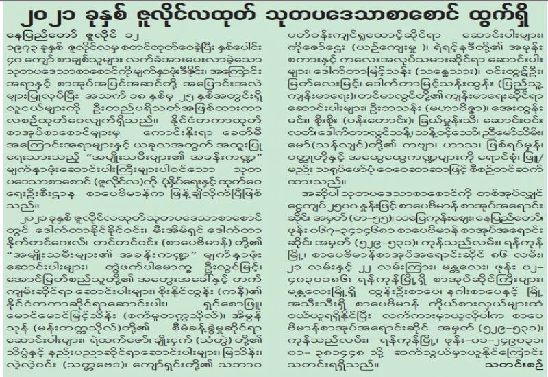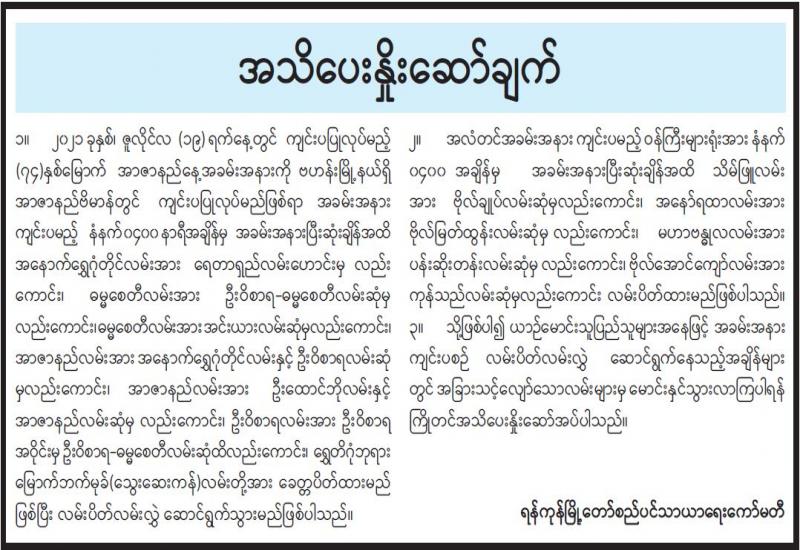 နိုင်ငံတော်စီမံအုပ်ချုပ်ရေးကောင်စီ၊ သတင်းထုတ်ပြန်ရေးအဖွဲ့၏ (၇/၂၀၂၁) ကြိမ်မြောက် သတင်းစာရှင်းလင်းပွဲကို ယနေ့နံနက်ပိုင်းတွင် ပြန်ကြားရေးဝန်ကြီးဌာန၌ ကျင်းပပြုလုပ်ပြီး နိုင်ငံတော်စီမံအုပ်ချုပ်ရေးကောင်စီ၊ သတင်းထုတ်ပြန်ရေး အဖွဲ့ခေါင်းဆောင် ဗိုလ်ချုပ် ဇော်မင်းထွန်း၊ ပြည်ထောင်စုရွေးကောက်ပွဲကော်မရှင် အဖွဲ့ဝင် ဦးခင်မောင်ဦး၊ ဌာနဆိုင်ရာများမှ ပြောရေးဆိုခွင့်ရှိသူများနှင့် ဌာနဆိုင်ရာ သတင်းထုတ်ပြန်ရေးအဖွဲ့ ကိုယ်စားလှယ်များက သတင်းမီဒီယာများ၏ သိရှိလိုသည့် မေးမြန်းမှုများကို ပြန်လည်ဖြေကြားသည်။