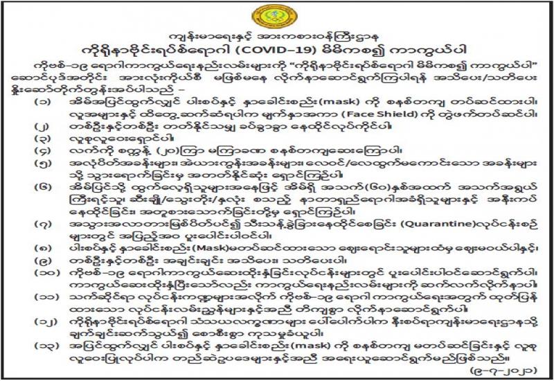 သယံဇာတနှင့် သဘာဝပတ်ဝန်းကျင်ထိန်းသိမ်းရေးဝန်ကြီးဌာန၊ Coronavirus Disease 2019 (COVID-19) ကာကွယ်၊ ထိန်းချုပ်ရေး ကြီးကြပ်ကွပ်ကဲရေးအဖွဲ့၏ (၁/၂၀၂၁) ကြိမ်မြောက် အစည်းအဝေးကို ယနေ့နံနက် ၉ နာရီခွဲတွင် ရုံးအမှတ်-၂၈၌ ကိုဗစ်-၁၉ ရောဂါ ကာကွယ်၊ ထိန်းချုပ် ရေးဆိုင်ရာ ညွှန်ကြားချက်များနှင့်အညီ ကျင်းပသည်။