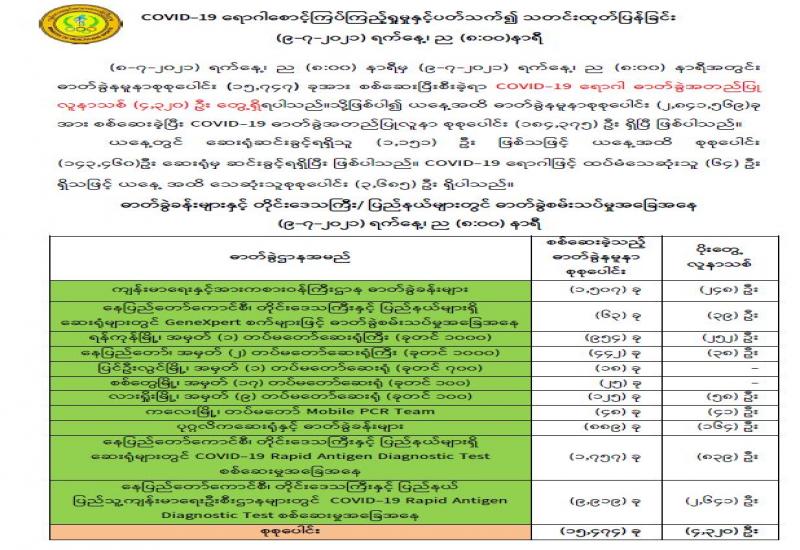 (၈-၇-၂၀၂၁) ရက်နေ့၊ ည (၈:၀၀) နာရီမှ (၉-၇-၂၀၂၁) ရက်နေ့၊ ည (၈:၀၀) နာရီအတွင်း ဓာတ်ခွဲနမူနာစုစုပေါင်း (၁၅,၇၄၇) ခုအား စစ်ဆေးပြီးစီးခဲ့ရာ COVID-19 ရောဂါ ဓာတ်ခွဲအတည်ပြု လူနာသစ် (၄,၃၂၀) ဦး တွေ့ရှိရပါသည်။သို့ဖြစ်ပါ၍ ယနေ့အထိ ဓာတ်ခွဲနမူနာစုစုပေါင်း (၂,၈၄၁,၅၆၉)ခု အား စစ်ဆေးခဲ့ပြီး COVID-19 ဓာတ်ခွဲအတည်ပြုလူနာ စုစုပေါင်း (၁၈၄,၃၇၅) ဦး ရှိပြီ ဖြစ်ပါသည်။