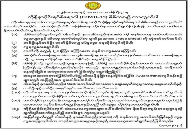 မြန်မာ့မီးရထားက ပြည်သူများ ခရီးသွားလာမှု လွယ်ကူအဆင်ပြေ စေရေးနှင့် ကုန်စည်များပို့ဆောင်နိုင်ရေး စီစဉ်ဆောင်ရွက်ပေးလျက်ရှိရာ ရထားလမ်းပိုင်းအသီးသီးတွင် လူစီးရထားများ ပြေးဆွဲပေးခြင်းကိုကျန်းမာရေးနှင့် အားကစားဝန်ကြီးဌာန၏ လမ်းညွှန်ချက်နှင့်အညီ ဘူတာအဝင်နှင့် ရထားများပေါ်တွင် ခရီးသည်များ၏ ကိုယ်အပူချိန် တိုင်းတာခြင်း၊ ဘူတာအဝင်ရှိ လက်ဆေးခုံများတွင် လက်ဆေးစေခြင်း၊ Mask တပ်ပြီး ဘူတာအတွင်းနှင့် ရထားပေါ်သို့ တက်ရောက်စေခြင်း၊ Social Distancing အတွက်တွဲများပေါ်တွင် နှစ်ယောက်ထိုင်နိုင်သောထိုင်ခုံ တစ်ခုံ၌ ခရီးသည်တစ်ဦးသာ ရောင်းချစေခြင်း၊ သတ်မှတ် ခရီးသည်ဦးရေမှ အပထိုင်ခုံမဲ့ လုံးဝမရောင်းစေခြင်းတို့ကို စီစဉ်ဆောင် ရွက်ပေးလျက်ရှိသည်။