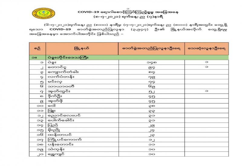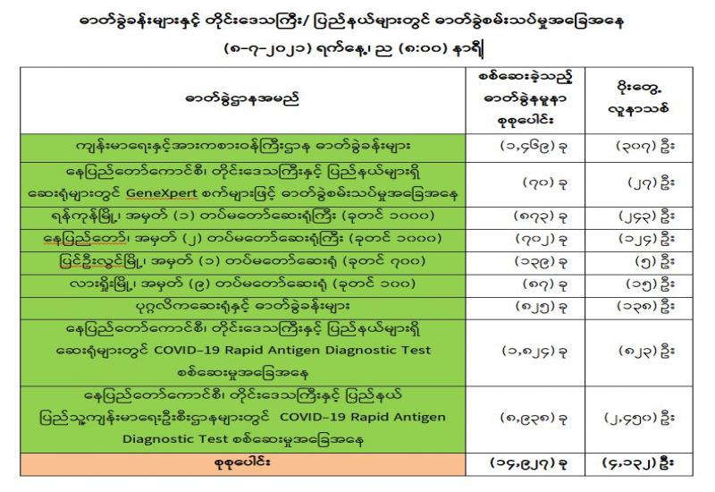 (၇-၇-၂၀၂၁) ရက်နေ့၊ ည (၈:၀၀) နာရီမှ (၈-၇-၂၀၂၁) ရက်နေ့၊ ည (၈:၀၀) နာရီအတွင်း ဓာတ်ခွဲနမူနာစုစုပေါင်း (၁၄,၉၂၇) ခုအား စစ်ဆေးပြီးစီးခဲ့ရာ COVID-19 ရောဂါ ဓာတ်ခွဲအတည်ပြု လူနာသစ် (၄,၁၃၂) ဦး တွေ့ရှိရပါသည်။သို့ဖြစ်ပါ၍ ယနေ့အထိ ဓာတ်ခွဲနမူနာစုစုပေါင်း (၂,၈၂၅,၈၂၂)ခု အား စစ်ဆေးခဲ့ပြီး COVID-19 ဓာတ်ခွဲအတည်ပြုလူနာ စုစုပေါင်း (၁၈၀,၀၅၅) ဦး ရှိပြီ ဖြစ်ပါသည်။