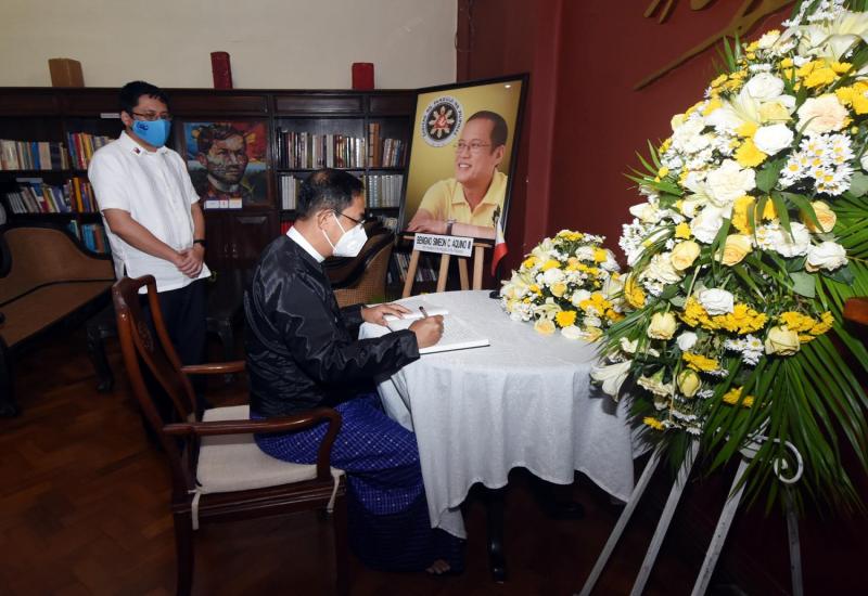 နိုင်ငံခြားရေးဝန်ကြီးဌာန မဟာဗျူဟာလေ့လာရေးနှင့် လေ့ကျင့်ရေးဦးစီးဌာန ညွှန်ကြားရေး မှူးချုပ် ဦးအောင်မြင့်သည် ၂၀၂၁ ခုနှစ် ဇွန် ၂၄ ရက်တွင် ကွယ်လွန်သွားသည့် ဖိလစ်ပိုင်နိုင်ငံ၏ သမ္မတ ဟောင်းဖြစ်သူ H.E. Benigno S. Aquino III အတွက် ရန်ကုန်မြို့ ဗဟန်းမြို့နယ် အမှတ် (၂၁) ဖိုးစိန်လမ်းရှိ မြန်မာနိုင်ငံဆိုင်ရာ ဖိလစ်ပိုင်သံရုံး၌ ဖွင့်လှစ်ထားရှိ သော ဝမ်းနည်းခြင်း အထိမ်းအမှတ်စာအုပ်၌ ယနေ့ မွန်းလွဲ ၃ နာရီခွဲတွင် သွားရောက် လက်မှတ်ရေးထိုးသည်။