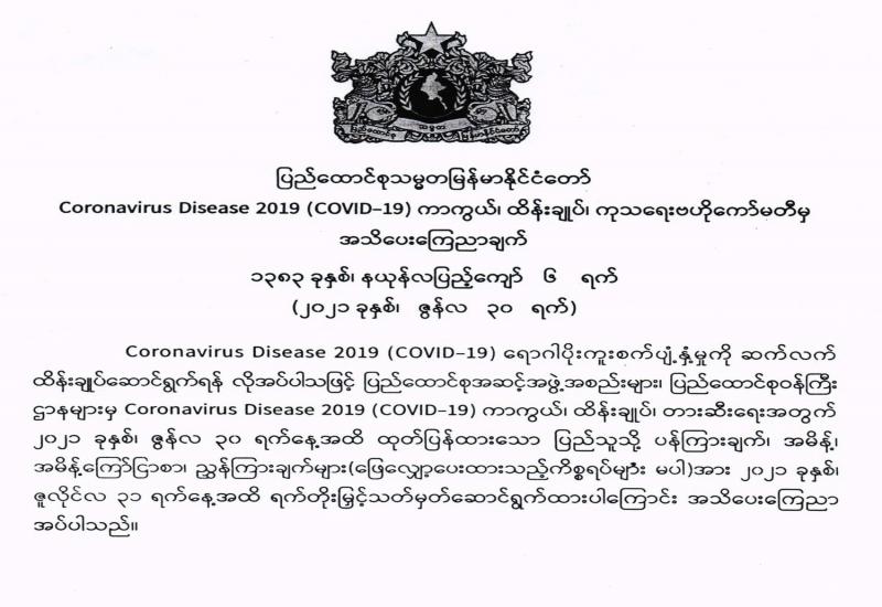 ပြည်ထောင်စုသမ္မတမြန်မာနိုင်ငံတော် Coronavirus Disease 2019 (COVID-19) ကာကွယ်၊ ထိန်းချုပ်၊ ကုသရေးဗဟိုကော်မတီမှ အသိပေးကြေညာချက်