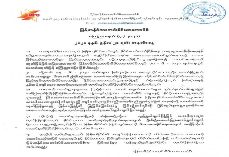 မကွေးတိုင်းဒေသကြီး၊ ပေါက်မြို့နယ်၊ ကင်းမကျေးရွာ မီးလောင်မှုဖြစ်စဉ်နှင့် ပတ်သက်၍ သတင်းမှားများအား ရည်ရွယ်ချက်ရှိရှိထုတ်ပြန်ခဲ့သည့် သတင်းဌာနအချို့နှင့် သံရုံးအချို့အား မြန်မာနိုင်ငံသတင်းမီဒီယာကောင်စီက ၂၁−၆−၂၀၂၁ ရက်နေ့တွင် ကြေညာချက်ထုတ်ပြန်၍ ပြင်းထန်စွာ ကန့်ကွက်ရှုတ်ချခဲ့သည်။