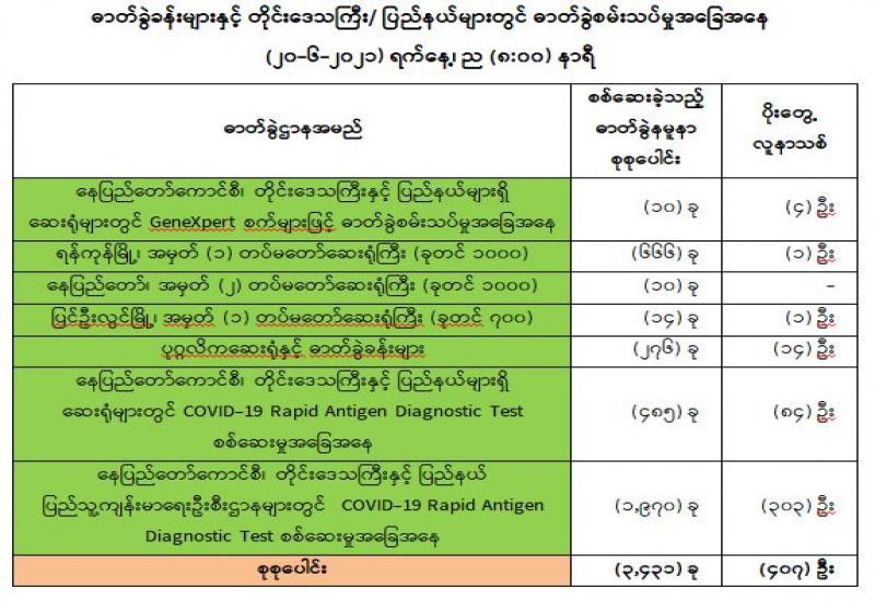 (၁၉-၆-၂၀၂၁) ရက်နေ့၊ ည (၈:၀၀) နာရီမှ (၂၀-၆-၂၀၂၁) ရက်နေ့၊ ည (၈:၀၀) နာရီအတွင်း ဓာတ်ခွဲနမူနာစုစုပေါင်း (၃,၄၃၁) ခုအား စစ်ဆေးပြီးစီးခဲ့ရာ COVID-19 ရောဂါ ဓာတ်ခွဲအတည်ပြု လူနာသစ် (၄၀၇) ဦး တွေ့ရှိရပါသည်။ သို့ဖြစ်ပါ၍ ယနေ့အထိ ဓာတ်ခွဲနမူနာ စုစုပေါင်း (၂,၆၇၄,၇၀၂) ခု အား စစ်ဆေးခဲ့ပြီး COVID-19 ဓာတ်ခွဲအတည်ပြုလူနာ စုစုပေါင်း (၁၄၈,၀၂၂) ဦး ရှိပြီ ဖြစ်ပါသည်။