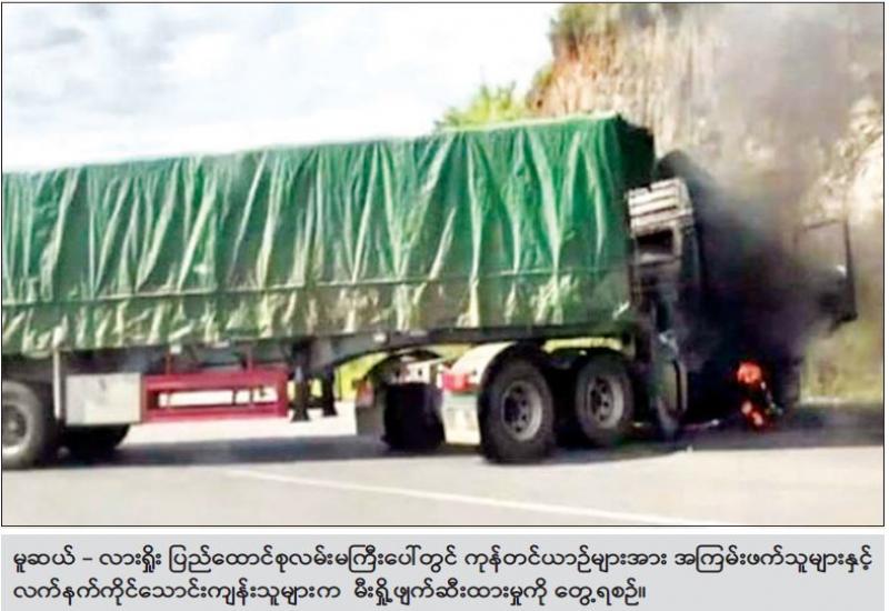ကရင်ပြည်နယ်၊ လှိုင်းဘွဲ့မြို့နယ်နှင့် ရှမ်းပြည်နယ်(မြောက်ပိုင်း)၊ မူဆယ်မြို့နယ်တို့၌ မြို့ဝင်ဘီးခွန်ဂိတ်နှင့် ကုန်တင်ယာဉ် ၃ စီးတို့အား ဆူပူအကြမ်းဖက်သူများနှင့် လက်နက်ကိုင် သောင်းကျန်းသူ များက မီးရှို့ဖျက်ဆီးခဲ့ကြောင်း သိရသည်။