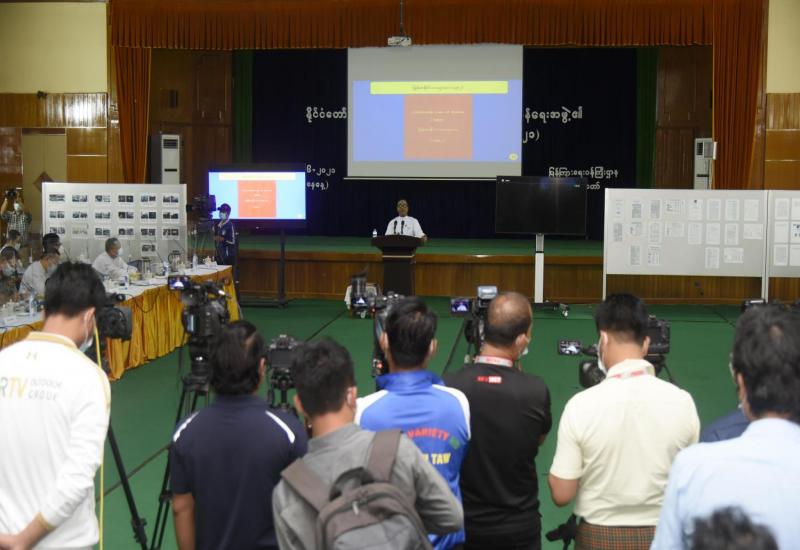 နိုင်ငံတော်စီမံအုပ်ချုပ်ရေးကောင်စီ၊ သတင်းထုတ်ပြန်ရေးအဖွဲ့၏ ၆/၂၀၂၁ ကြိမ်မြောက် သတင်းစာရှင်းလင်းပွဲကို ယနေ့မွန်းလွဲပိုင်းတွင် ပြန်ကြားရေးဝန်ကြီးဌာန၌ ကျင်းပပြုလုပ်ပြီး နိုင်ငံတော်စီမံအုပ်ချုပ်ရေးကောင်စီ၊ သတင်းထုတ်ပြန်ရေး အဖွဲ့ခေါင်းဆောင် ဗိုလ်ချုပ် ဇော်မင်းထွန်း၊ ပြည်ထောင်စုရွေးကောက်ပွဲကော်မရှင် အဖွဲ့ဝင် ဦးခင်မောင်ဦး၊ ဌာနဆိုင်ရာများမှ ပြောရေးဆိုခွင့်ရှိသူများနှင့် ဌာနဆိုင်ရာ သတင်းထုတ်ပြန်ရေးအဖွဲ့ ကိုယ်စားလှယ်များက သတင်းမီဒီယာများ၏ သိရှိလိုသည့် မေးမြန်းမှုများကို ပြန်လည်ဖြေကြားသည်။