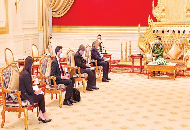 နိုင်ငံတော်စီမံအုပ်ချုပ်ရေးကောင်စီ ဥက္ကဋ္ဌ၊ တပ်မတော်ကာကွယ်ရေးဦးစီးချုပ် ဗိုလ်ချုပ်မှူးကြီး မင်းအောင်လှိုင် သည် ဘရူနိုင်း ဒါရူဆလမ်နိုင်ငံ၊ နိုင်ငံခြားရေးဝန်ကြီး H.E. Dato Erywan Pehin Yusof နှင့် အာဆီယံ အတွင်း ရေးမှူးချုပ် H.E. Dato Lim Jock Hoi တို့အား ယနေ့နံနက်ပိုင်းတွင် နိုင်ငံတော် စီမံအုပ်ချုပ်ရေး ကောင်စီဥက္ကဋ္ဌရုံး သံတမန်ဆောင်၊ ဧည့်ခန်းမ ၌လက်ခံတွေ့ဆုံသည်။
