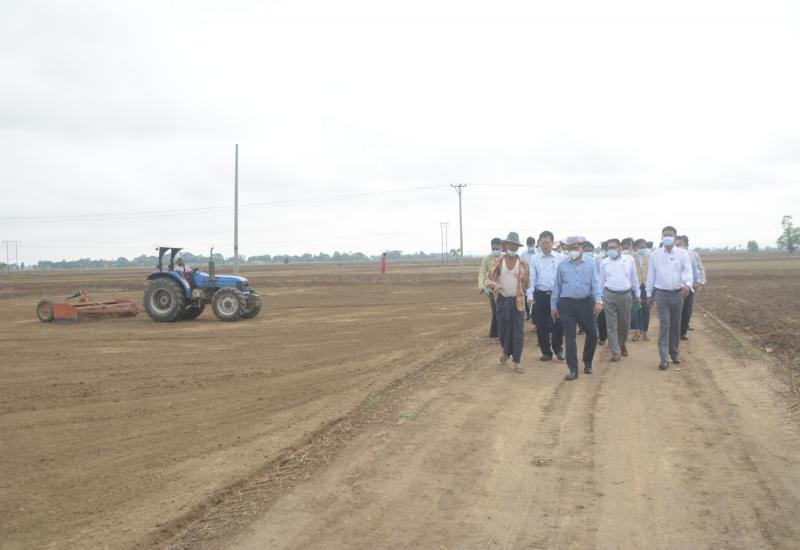 စိုက်ပျိုးရေး၊ မွေးမြူရေးနှင့် ဆည်မြောင်းဝန်ကြီးဌာန ဒုတိယဝန်ကြီး ဒေါက်တာ အောင်ကြီး သည် မေ ၂၉ ရက် နံနက်ပိုင်းက ရေတာရှည်မြို့နယ် သပြေတန်းကျေးရွာအုပ်စု၌ စက်မှုလယ်ယာစနစ်ကျ လယ်ယာမြေဖော်ထုတ်ခြင်းလုပ်ငန်းခွင်ကို ကြည့်ရှုစစ်ဆေးသည်။