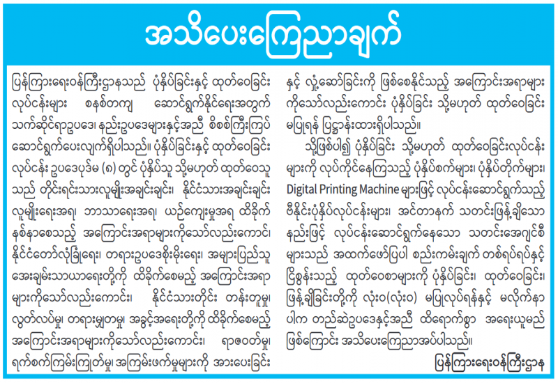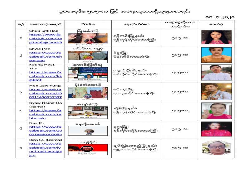 နိုင်ငံတော်၏ အုပ်ချုပ်မှုယန္တရားပျက်ပြားစေရန်ရည်ရွက်ချက်ဖြင့် နိုင်ငံ့ဝန်ထမ်းများအား CDM လှုပ်ရှားမှုတွင် ပါဝင်စေရန်လှုံ့ဆော်ခြင်း၊ CRPH မတရားအသင်းအား ထောက်ခံသည့် အကြောင်းအရာများ၊ မမှန်သတင်းများအားဖြန့်ဝေခြင်း၊ နိုင်ငံတော်တည်ငြိမ်အေးချမ်းမှုကို ပျက်ပြားစေပြီး ဆူပူအုံကြွမှုဖြစ်ပေါ်စေရန်နှင့် အများပြည်သူအထိတ်တလန့်ဖြစ်စေရန် အတွက် သွေးထိုးလှုံ့ဆော်မှုများပြုလုပ်ခြင်း၊ Social Pumishment ပြုလုပ်ခြင်းများကို လူမှုကွန်ရက် စာမျက်နှာများတွင် ရည်ရွယ်ချက်ရှိရှိ ဖြင့်ဖော်ပြခြင်းနှင့် ဖြန့်ဝေခြင်းများ ဆောင်ရွက် လျက်ရှိသည့် အောက်ဖော်ပြပါ အနုပညာရှင်အချို့နှင့် အခြားပါဝင်ပတ်သက်သူများအား ရာဇသတ်ကြီးပုဒ်မ ၅၀၅-က ဖြင့် အမှုဖွင့်အရေးယူ ဆောင်ရွက်လျက်ရှိပါသည်။