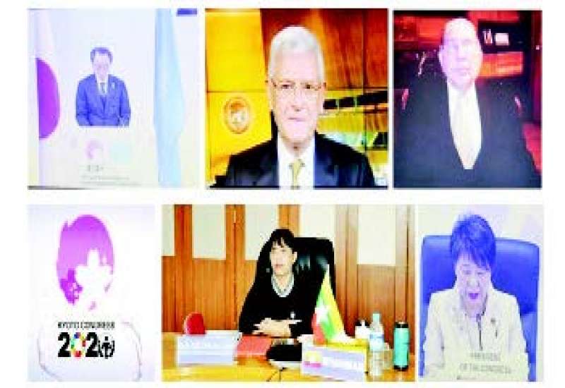 ဂျပန်နိုင်ငံ ကျိုတိုအပြည်ပြည်ဆိုင်ရာ ညီလာခံ စင်တာ၌ ကျင်းပသော 14th United Nations Congress on Crime Prevention and Criminal Justice သို့ ပြည်ထောင်စုရှေ့နေချုပ် ဒေါက်တာ သီတာဦး ဦးဆောင်၍ ပြည်ထဲရေး ဝန်ကြီးဌာနနှင့် ပြည်ထောင်စုရှေ့နေချုပ်ရုံးတို့ပါဝင်သည့် မြန်မာ ကိုယ်စားလှယ်အဖွဲ့ သည် ဗီဒီယို ကွန်ဖရင့် စနစ်ဖြင့် တက်ရောက်ကြသည်။