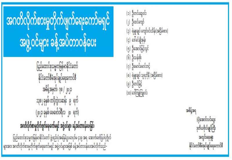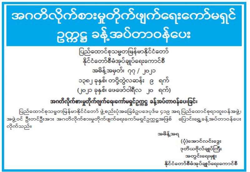 နိုင်ငံတော်စီမံအုပ်ချုပ်ရေးကောင်စီ၏ ပြည်သူသို့အသိပေးချက် နိုင်ငံတော်၏အကျိုးကို သယ်ပိုးဆောင်ရွက်ရန်အတွက် နိုင်ငံ့တာဝန်များကို မပျက်မကွက် ဆက်လက် ထမ်းဆောင်လျက်ရှိသည့် နိုင်ငံ့ဝန်ထမ်းများ လုပ်ငန်းခွင် မဝင်နိုင်အောင် နိုင်ငံတော်ကို ဆန့်ကျင်နှောင့်ယှက်မှုပြုနေသူအချို့က နည်းအမျိုးမျိုးဖြင့် ဖိအားပေးခြင်း၊ ခြိမ်းခြောက်ခြင်းများ ပြုလုပ်နေကြောင်းကို ကြားသိနေရပါသည်။ ဖိအားပေးခြိမ်းခြောက်သူများအနေဖြင့် ယင်းလုပ်ရပ် များသည် ဥပဒေနှင့်ဆန့်ကျင်သကဲ့သို့ မိမိ၏အခွင့်အရေးနှင့် လွတ်လပ်ခွင့်များကို ကျင့်သုံးခြင်း ဆိုင်ရာ မူသဘောတရားများနှင့်လည်း ဆန့်ကျင်နေပါသည်။ ဝန်ထမ်းမဟုတ်သူ ပြည်သူလူထု အချင်းချင်းကြားတွင်လည်း အလားတူ
