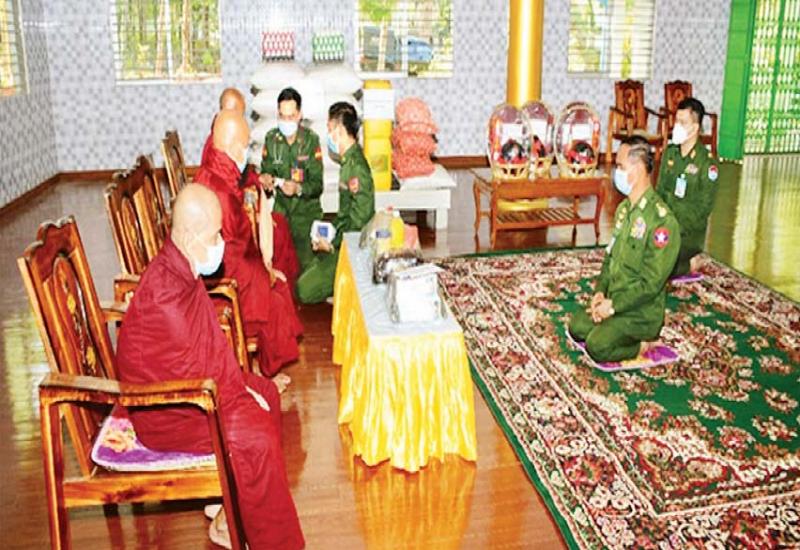 ကိုဗစ် - ၁၉ ကူးစက်ရောဂါ ကာကွယ်ထိန်းချုပ်ရေးကာလတွင် ဘုန်းတော်ကြီးကျောင်းများနှင့် သီလရှင်ကျောင်းများ၌ ဆွမ်းကိစ္စများ အဆင်ပြေစေရန်အတွက် တိုင်းစစ်ဌာနချုပ်များအလိုက် လှူဒါန်းလျက်ရှိရာ ယနေ့နံနက်ပိုင်းတွင် ကာကွယ်ရေးဦးစီးချုပ်ရုံး(ကြည်း)မှ ဒုတိယဗိုလ်ချုပ်ကြီး အောင်စိုး၊ ကမ်းရိုးတန်းဒေသ တိုင်းစစ်ဌာနချုပ် တိုင်းမှူး ဗိုလ်မှူးချုပ် စောသန်းလှိုင်နှင့် တာဝန်ရှိ သူများသည် တနင်္သာရီတိုင်းဒေသကြီး ထားဝယ်မြို့နယ် သပြေချောင်းကျေးရွာရှိ သပြေချောင်း ဘုန်းတော်ကြီးကျောင်းတိုက်သို့ သွားရောက်၍ ကျောင်းတိုက်ဆရာတော် ဘန္တနန္ဒဝံသ အမှူးပြု သောသံဃာတော်များအား ဖူးမြော်ကြည်ညို