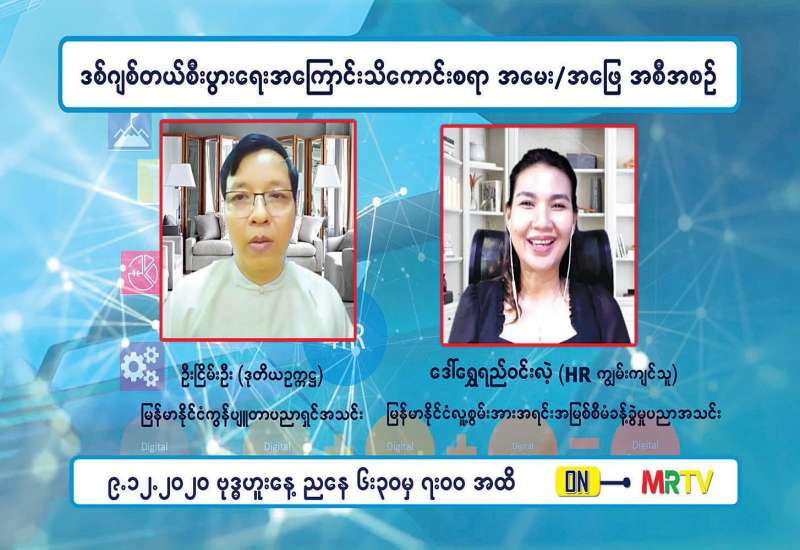 မြန်မာနိုင်ငံ၏ ဒစ်ဂျစ်တယ် အသွင်ပြောင်းမှုတွင် အိုင်စီတီ (ICT) အခန်းကဏ္ဍ၏ အရေးပါမှုနှင့် လက်ရှိမြန်မာနိုင်ငံ၏ အလုပ်အကိုင် အခွင့်အလမ်းအခြေအနေ၊ လူ့စွမ်းအား အရင်းအမြစ် အခြေအနေများနှင့်ပတ်သက်ပြီး ဗဟုသုတမျှဝေပေးမည့် ဒစ်ဂျစ်တယ်စီးပွားရေးအကြောင်း သိကောင်းစရာ အမေး / အဖြေ အစီအစဉ်ကို မြန်မာ့အသံနှင့် ရုပ်မြင် သံကြားမှ ဒီဇင်ဘာ ၉ ရက် ညနေ ၆ နာရီခွဲတွင် ထုတ်လွှင့်ပြသခဲ့ရာ ပြည်သူများ သိရှိနိုင်ရန်အတွက် ပြန်လည်ဖော်ပြလိုက်ပါသည်။