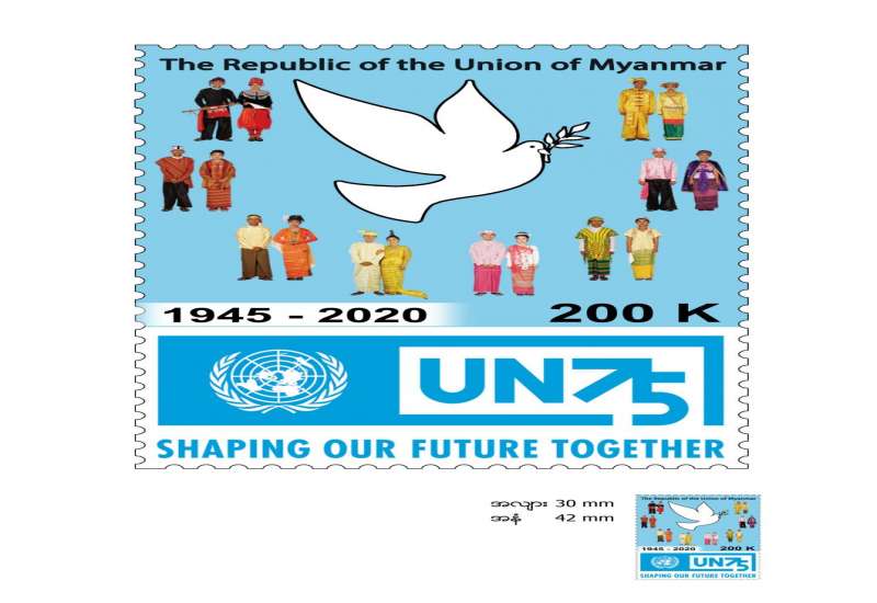 ကုလသမဂ္ဂဖွဲ့စည်းတည်ထောင်သည့် (၇၅) နှစ်ပြည့် အထိမ်းအမှတ်အနေဖြင့် နိုင်ငံခြားရေး ဝန်ကြီးဌာန အစီအစဉ်ဖြင့် (UN75) Logo ပါ အထူးထုတ် စာပို့တံဆိပ်ခေါင်းသစ် (၂၀၀ ကျပ်တန်) (၁) မျိုးအား ပို့ဆောင်ရေးနှင့်ဆက်သွယ်ရေးဝန်ကြီးဌာန၊ မြန်မာ့စာတိုက် လုပ်ငန်းမှ ဒီဇင်ဘာ (၁) ရက်၊ မြန်မာသက္ကရာဇ် ၁၃၈၂ ခုနှစ်၊ တန်ဆောင်းမုန်းလပြည့်ကျော် (၂) ရက် (အင်္ဂါနေ့)၊ နံနက် ၉ နာရီခွဲမှစတင်၍ နေပြည်တော်ဗဟိုစာတိုက်ကြီး၊ ရန်ကုန်စာတိုက်ကြီး၊ မန္တလေးစာတိုက်ကြီးတို့နှင့် တိုင်းဒေသကြီး/ ပြည်နယ်များရှိ စာတိုက်များတွင် ရောင်းချပေးသွားမည်ဖြစ်သည်။