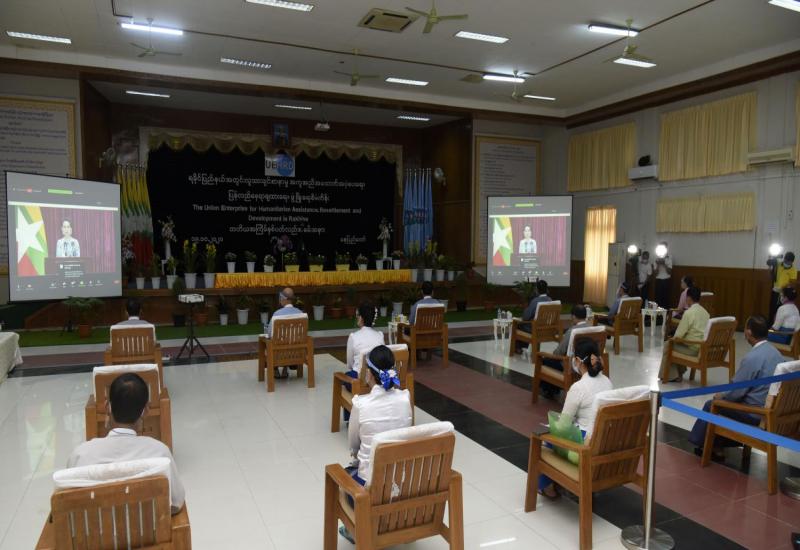 ရခိုင်ပြည်နယ်အတွင်း လူသားချင်းစာနာမှု အကူအညီ အထောက်အပံ့ပေးရေး၊ ပြန်လည် နေရာချထားရေး ဖွံ့ဖြိုးရေးစီမံကိန်း UEHRD ကော်မတီ၏ ၃ နှစ်ပြည့် နှစ်ပတ်လည် အခမ်းအနားကို ယနေ့ နံနက် ၉ နာရီခွဲတွင် နေပြည်တော်ရှိ လူမှုဝန်ထမ်း၊ ကယ်ဆယ်ရေးနှင့် ပြန်လည်နေရာချထားရေးဝန်ကြီးဌာန အစည်းအဝေးခန်မ၌ Zoom Application Online System ဖြင့် ကျင်းပသည်။