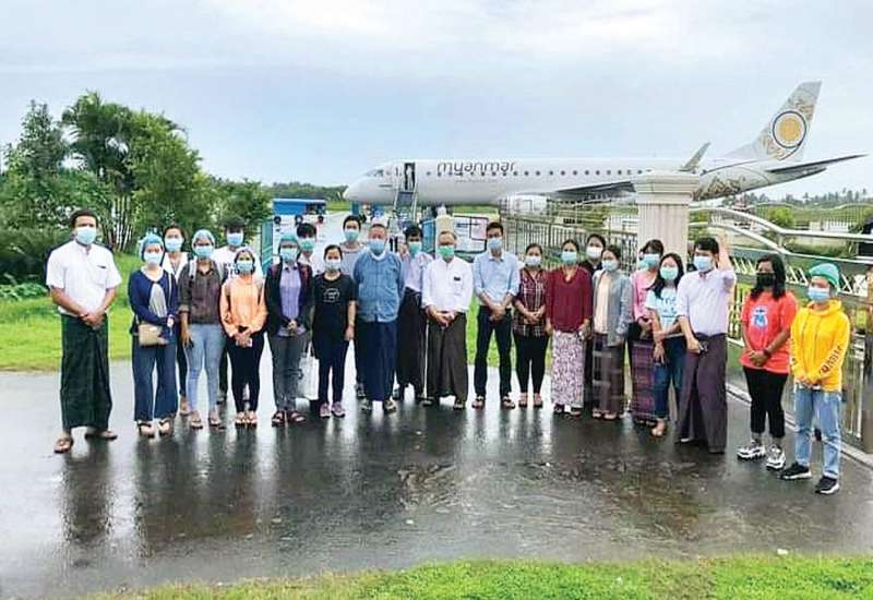 ရခိုင်ပြည်နယ်၏ ကိုဗစ် - ၁၉ ရောဂါ ကာကွယ်၊ ကုသ၊ ထိန်းချုပ်ရေး လုပ်ငန်းများ၌ “မိမိဆန္ဒအလျောက်” ယာယီ တာဝန် ထမ်းဆောင်မည့် ဆရာဝန်နှင့် သူနာပြုများပါဝင်သော အဖွဲ့သည် ယနေ့နံနက်ပိုင်းတွင် ဒုတိယ အသုတ်အနေဖြင့် မြန်မာ အမျိုးသားလေကြောင်း အထူး လေယာဉ်ဖြင့် စစ်တွေမြို့သို့ ထပ်မံ ရောက်ရှိ ကြသည်။