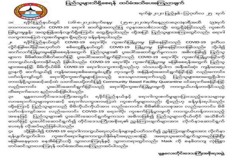 COVID-19 ရောဂါပိုး ကူးစက်ပြန့်ပွားနေမှုများနှင့်ပတ်သက်၍ မန္တလေးတိုင်းဒေသကြီး အစိုးရက အသိပေး ထုတ်ပြန်ချက် တစ်စောင်ကို သြဂုတ် ၂၅ ရက် ရက်စွဲဖြင့် ထုတ်ပြန်ခဲ့သည်။