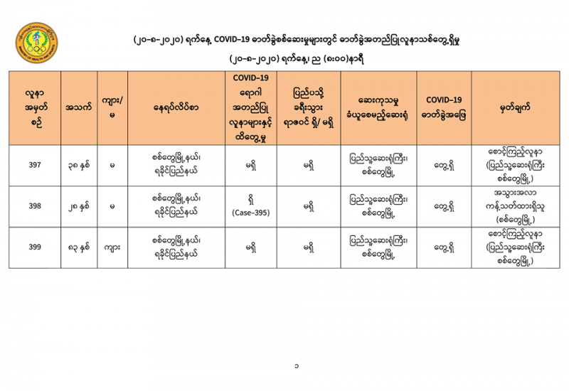 ၁။ (၂၀-၈-၂၀၂၀) ရက်နေ့အတွက် COVID-19 ရောဂါ ဓာတ်ခွဲစစ်ဆေးရာတွင် -