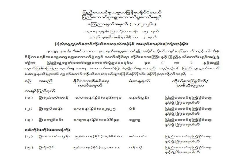 ပြည်သူ့လွှတ်တော်ကိုယ်စားလှယ်အဖြစ် ရွေးကောက်တင်မြှောက်ခံရသူများ အမည်စာရင်း ကြေညာခြင်း
