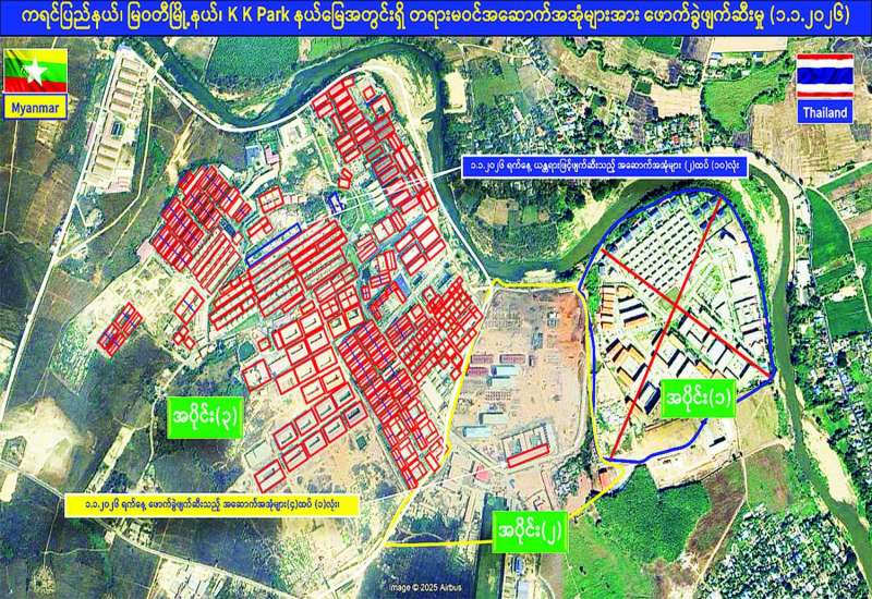မြန်မာနိုင်ငံအစိုးရအနေဖြင့် အွန်လိုင်းလိမ်လည်လောင်းကစားမှုများ အများဆုံးအခြေချလုပ်ကိုင် လျက်ရှိကြသည့် ရွှေကုက္ကိုလ် နယ်မြေနှင့် KK Park နယ်မြေများရှိ တရားမဝင်အဆောက်အအုံများအတွင်း ဝင်ရောက်ရှင်းလင်း၍ အွန်လိုင်းလိမ်လည် လောင်းကစားမှု လုပ်ငန်းစဉ်များတွင်အသုံးပြုခဲ့သည့် သိမ်းဆည်းရမိပစ္စည်းများနှင့် တရားမဝင် အဆောက်အအုံများအား စနစ်တကျ ဖြိုချဖျက်ဆီးခြင်းများကို အဖွဲ့စုံပါဝင်သည့် ပူးပေါင်းအဖွဲ့ဖြင့် ဆောင်ရွက်လျက်ရှိရာ ယနေ့တွင်လည်း KK Park နယ်မြေအတွင်းရှိ တရားမဝင်အဆောက်အအုံ ၁၁ လုံးကို ထပ်မံဖြိုချဖျက်ဆီးခဲ့ကြောင်း သိရသည်။