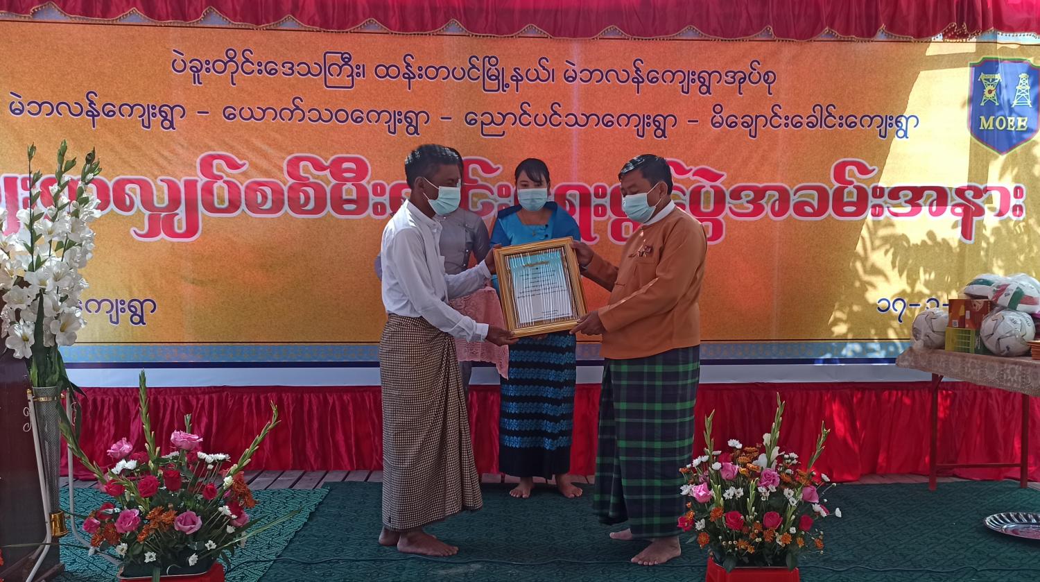 ယင်းနောက် တောင်ငူခရိုင်လျှပ်စစ်အင်ဂျင်နီယာ ဦးမျိုးအောင်စံက လျှပ်စစ်အန္တရာယ် ကင်းရှင်းရေးအတွက် လိုက်နာရမည့်အချက်များအား ကျေးရွာသူ ကျေးရွာသားများ သိရှိရန် အသိပညာပေးပြောကြားပြီး လျှပ်စစ်မီးလင်းရေးအတွက် ပံ့ပိုးကူညီဆောင်ရွက်ပေးသူများနှင့် စေတနာရှင် အလှူရှင်များအား ကျေးရွာ မီးလင်းရေးကော်မတီနှင့် လွှတ်တော်ကိုယ်စားလှယ်များက ဂုဏ်ပြုမှတ်တမ်းများပေးအပ်ခဲ့ကြသည်။
