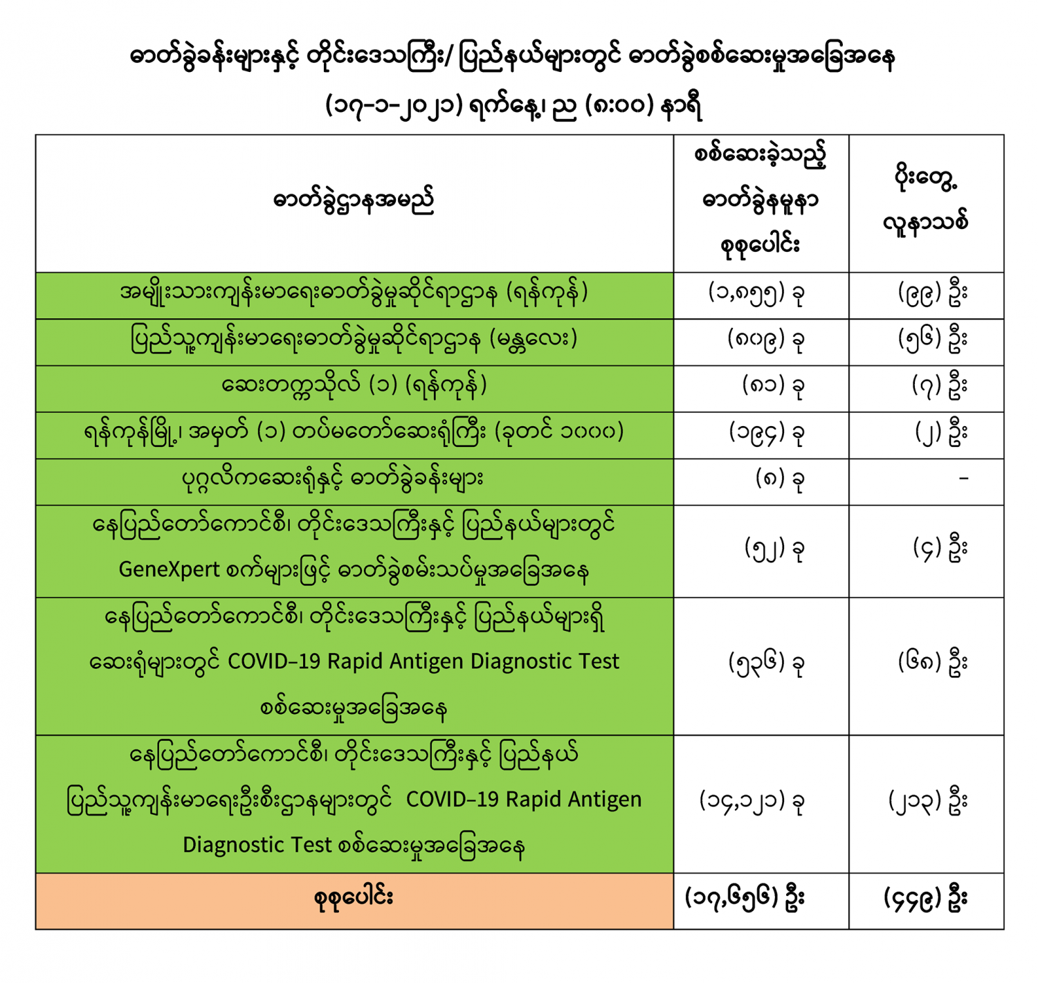 COVID-19 ရောဂါစောင့်ကြပ်ကြည့်ရှုမှုနှင့်ပတ်သက်၍ သတင်းထုတ်ပြန်ခြင်း (၁၇-၁-၂၀၂၁) ရက်နေ့၊ ည (၈:၀၀)နာရီ 01/17/2021 (၁၆-၁-၂၀၂၁) ရက်နေ့၊ ည (၈:၀၀) နာရီမှ (၁၇-၁-၂၀၂၁) ရက်နေ့၊ ည (၈:၀၀) နာရီ အတွင်း ဓာတ်ခွဲနမူနာ စုစုပေါင်း (၁၇,၆၅၆) ခုအား စစ်ဆေးပြီးစီးခဲ့ရာ COVID-19 ရောဂါ ဓာတ်ခွဲ အတည်ပြု လူနာသစ် (၄၄၉) ဦး တွေ့ရှိရပါသည်။ #Ministry_of_Health_and_Sports, #MoHS, #COVID19LabResults, #ကိုရိုနာဗိုင်းရပ်စ်, #ဓာတ်ခွဲအဖြေ