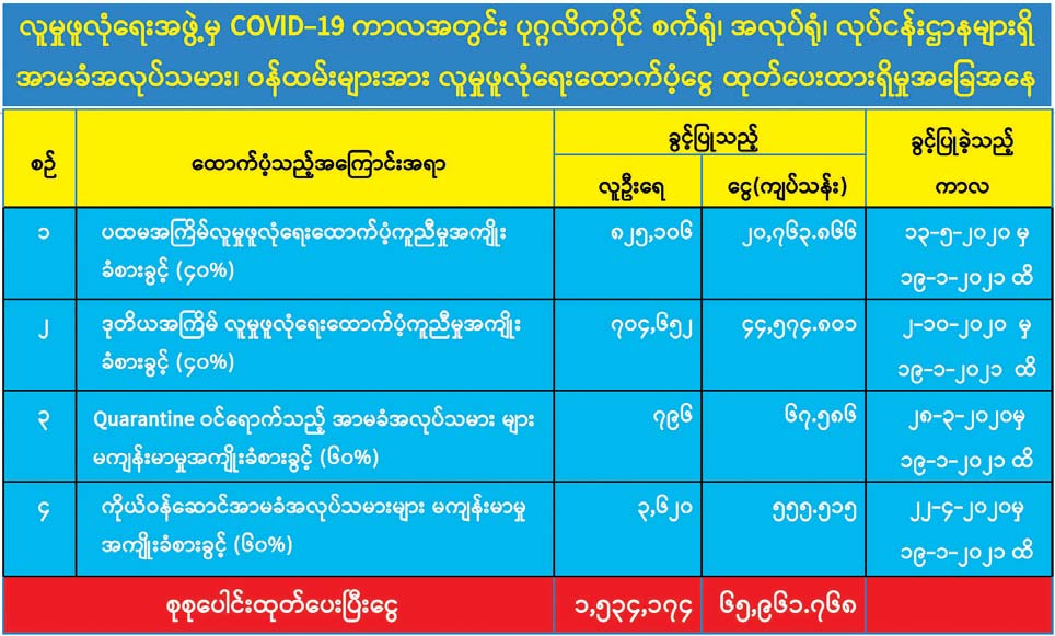 လူမှုဖူလုံရေးအဖွဲ့မှ COVID-19 ကာလအတွင်း ပုဂ္ဂလိကပိုင်စက်ရုံ၊ အလုပ်ရုံ၊ လုပ်ငန်းဌာနများရှိ အာမခံ အလုပ်သမား၊ ဝန်ထမ်းများအား လူမှုဖူလုံရေးထောက်ပံ့ ငွေ ထုတ်ပေးထားရှိမှု အခြေအနေ