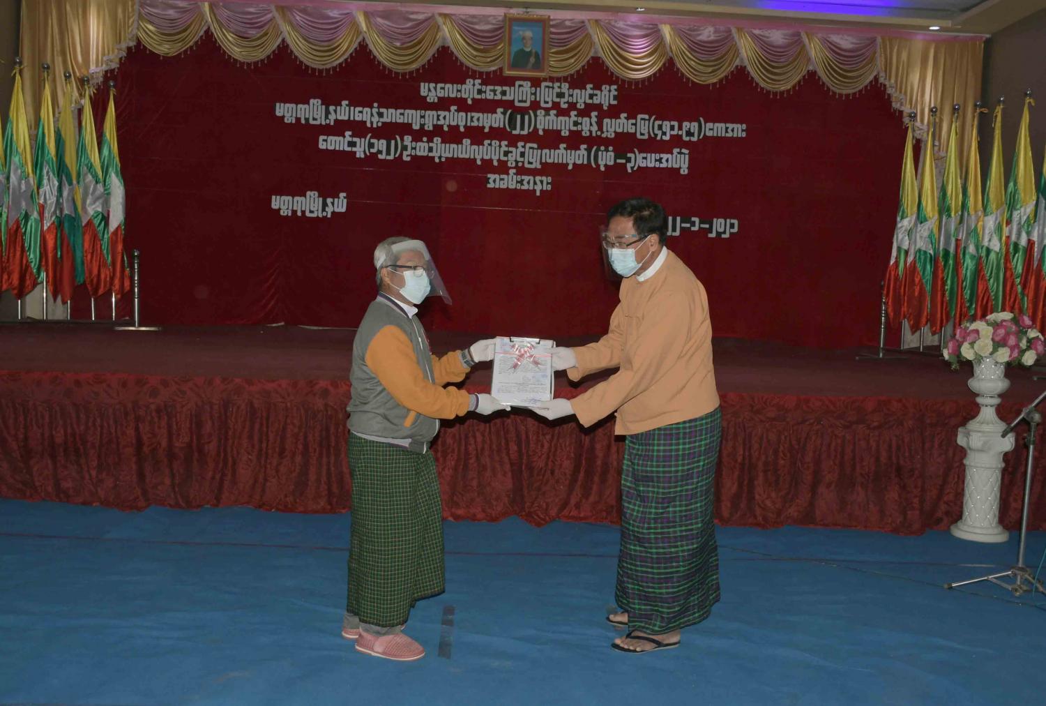ရှေးဦးစွာ မန္တလေးတိုင်းဒေသကြီးအစိုးရအဖွဲ့ ဝန်ကြီးချုပ်ဒေါက်တာဇော်မြင့်မောင်မှ အဖွင့်အမှာစကား ပြောကြားခဲ့သည်။ ထို့နောက် မန္တလေးတိုင်းဒေသကြီးဝန်ကြီးချုပ်မှ အမှတ် (၂၂) စိုက်ကွင်း ကွင်းအမှတ်(၁၄၈)ကွင်း၊ တောင်သူများကိုယ်စား တောင်သူကိုယ်စားလှယ် ဦးအေးမောင်ထံသို့လည်းကောင်း၊ မန္တလေးတိုင်းဒေသကြီးအစိုးရအဖွဲ့ စိုက်ပျိုးရေး၊ မွေးမြူရေးနှင့် ဆည်မြောင်းဝန်ကြီး ဒေါက်တာစိုးသန်းမှ အမှတ်(၂၂)စိုက်ကွင်း ကွင်းအမှတ် (၁၄၉-က)ကွင်း၊ တောင်သူများကိုယ်စား တောင်သူကိုယ်စားလှယ် ဦးဝင်းမောင်ထံသို့ လည်းကောင်း၊ မန္တလေးတိုင်းဒေသကြီးအစိုးရအဖွဲ့ သယံဇာတနှင့် သဘာဝပတ်ဝန်းကျင် ထိန်းသိမ်းရေးဝန်ကြီး ဦးမျိုးသစ်မှ အမှတ်(၂၂)စိုက်ကွင်း ကွင်းအမှတ်(၁၄၉)ကွင်း၊ တောင်သူ များကိုယ်စား တောင်သူကိုယ်စားလှယ် ဦးကြည်လင်းထံသို့လည်းကောင်း၊ မန္တလေးတိုင်းဒေသကြီးအစိုးရအဖွဲ့ လူဝင်မှုကြီးကြပ်ရေးနှင့် လူ့စွမ်းအားအရင်းအမြစ်ဝန်ကြီး ဦးအောင်ကြည်မှ အမှတ်(၂၂) စိုက်ကွင်း ကွင်းအမှတ်(၁၄၉)ကွင်း၊ တောင်သူများကိုယ်စား တောင်သူကိုယ်စားလှယ် ဦးစိုးမြင့်ထံသို့ လည်းကောင်း ယာယီလုပ်ပိုင်ခွင့်ပြုလက်မှတ် ပုံစံ(၃)များ အသီးသီးပေးအပ်ခဲ့ကြသည်။ ဆက်လက်၍ ယာယီလုပ်ပိုင်ခွင့်ပြုလက်မှတ် ပုံစံ(၃)ရရှိသည့် တောင်သူများကိုယ်စား တောင်သူကိုယ်စားလှယ် ဦးဘိုသောင်းမှ ကျေးဇူး တင်စကားပြောကြားခဲ့သည်။