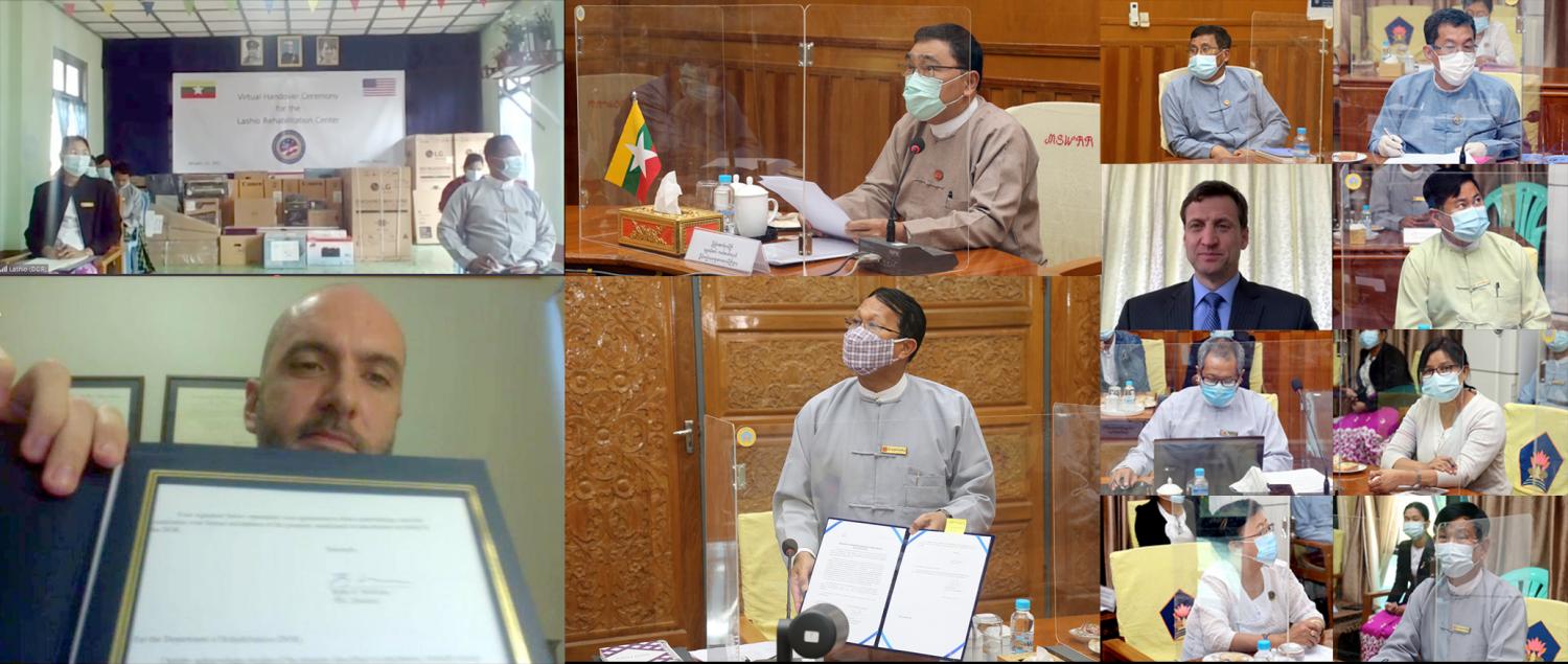 လားရှိုးမူးယစ်ဆေးဖြတ်ပြီးသူများ ပြန်လည်ထူထောင်ရေးစခန်းတွင် ဖွင့်လှစ်မည့် အမျိုးသမီးများ ပြန်လည်ထူထောင်ရေးသင်တန်းအတွက် လိုအပ်သောအထောက်အကူပြု ပစ္စည်းများကို မြန်မာနိုင်ငံဆိုင်ရာ အမေရိကန်နိုင်ငံသံအမတ်ကြီးက လူမှုဝန်ထမ်း၊ ကယ်ဆယ်ရေးနှင့် ပြန်လည်နေရာချထားရေးဝန်ကြီးဌာနသို့ လွှဲပြောင်းပေးအပ်ပွဲအခမ်းအနားကို ယနေ့မွန်းလွဲပိုင်း၌ အဆိုပါဝန်ကြီးဌာနတွင် Virtual Meeting ဖြင့် ကျင်းပသည်။