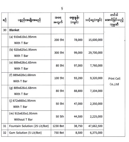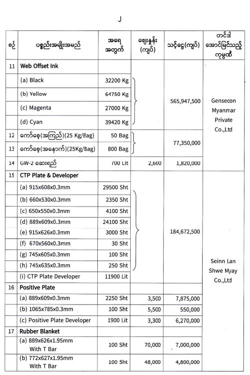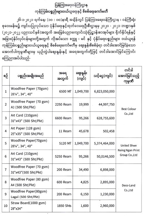 ၂၆-၁-၂ဝ၂၁ ရက်နေ့၊ (၁၀ : ၀ဝ)နာရီ အချိန်တွင် ပြန်ကြားရေးဝန်ကြီးဌာန ၊ ဝန်ကြီးရုံး စုဝေးခန်းမ၌ ကျင်းပပြုလုပ်သော ပုံနှိပ်ရေးနှင့်ထုတ်ဝေရေးဦးစီးဌာနမှ ၂၀၂၀ - ၂၀၂၁ ဘဏ္ဍာနှစ် (၂၀၂၁-၂၀၂၂ ပညာသင်နှစ်)အတွက် အခြေခံပညာကျောင်းသုံးပြဋ္ဌာန်းစာအုပ်များ ရိုက်နှိပ်ရန်နှင့် အခြားပုံနှိပ်လုပ်ငန်းများတို့အတွက် လိုအပ်သော စက္ကူ ၊ မင် နှင့် ပုံနှိပ်ရေးပစ္စည်းများ ဝယ်ယူရန် ကုန်ကြမ်းပစ္စည်းများဝယ်ယူရေးနှင့် စိစစ်ရေးကော်မတီမှ စျေးနှုန်းစိစစ်ခဲ့ရာ တင်ဒါအောင်မြင် ခဲ့သော အောက်ပါကုမ္ပဏီများမှ ယှဉ်တွဲပါစျေးနှုန်းနှင့် အရေအတွက်တို့ဖြင့် တင်ဒါအောင်မြင် ကြောင်း ကြေညာအပ်ပါသည်-