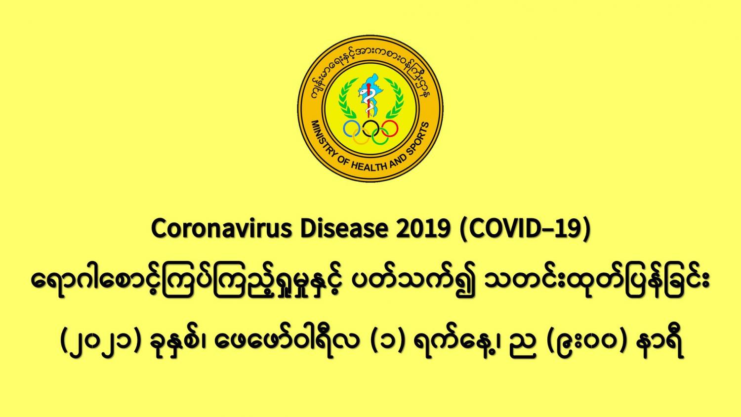 (၃၁-၁-၂၀၂၁)ရက်နေ့၊ ည (၈:၀၀)နာရီမှ (၁-၂-၂၀၂၁)ရက်နေ့၊ ည (၈:၀၀)နာရီအတွင်း ဓာတ်ခွဲ နမူနာ စုစုပေါင်း (၉,၀၁၉)ခု အား စစ်ဆေးပြီးစီးခဲ့ရာ COVID-19 ရောဂါ ဓာတ်ခွဲအတည်ပြုလူနာသစ် (၂၀၉) ဦး တွေ့ရှိရပါသည်။