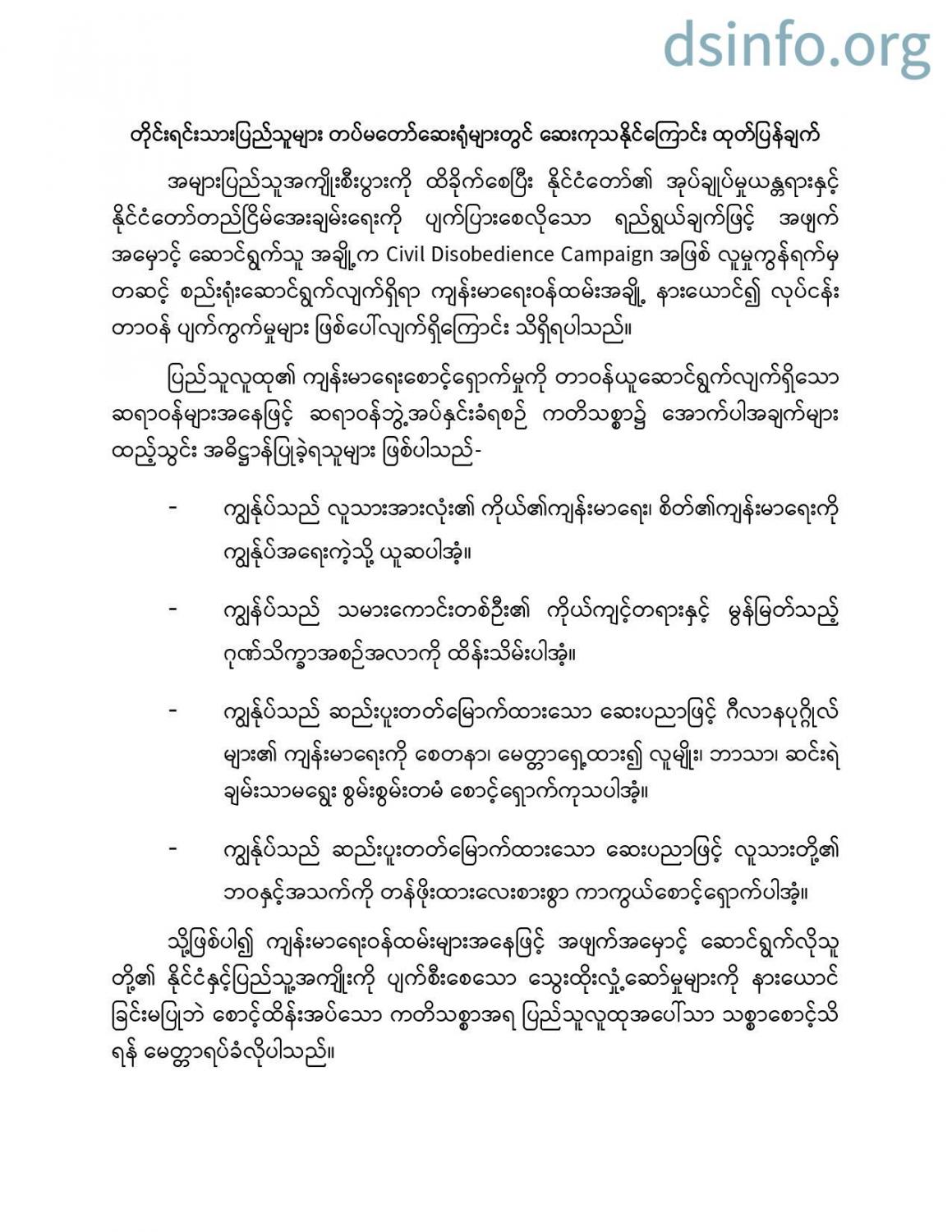 အဆိုပါထုတ်ပြန်ချက်တွင် အများပြည်သူအကျိုးစီးပွားကို ထိခိုက်စေပြီး နိုင်ငံတော်၏အုပ်ချုပ်မှု ယန္တရားနှင့် နိုင်ငံတော်တည်ငြိမ် အေးချမ်းရေး ကို ပျက်ပြားစေလိုသော ရည်ရွယ်ချက်ဖြင့် အဖျက် အမှောင့်ဆောင်ရွက်သူအချို့က Civil Disobedience Campaign အဖြစ် လူမှုကွန်ရက်မှ တစ်ဆင့် စည်းရုံးဆောင်ရွက်လျက်ရှိရာ ကျန်းမာရေး ဝန်ထမ်းအချို့ နားယောင်၍ လုပ်ငန်းတာဝန်ပျက်ကွက်မှုများ ဖြစ်ပေါ်လျက်ရှိသည် ကို သိရှိရပါကြောင်း။