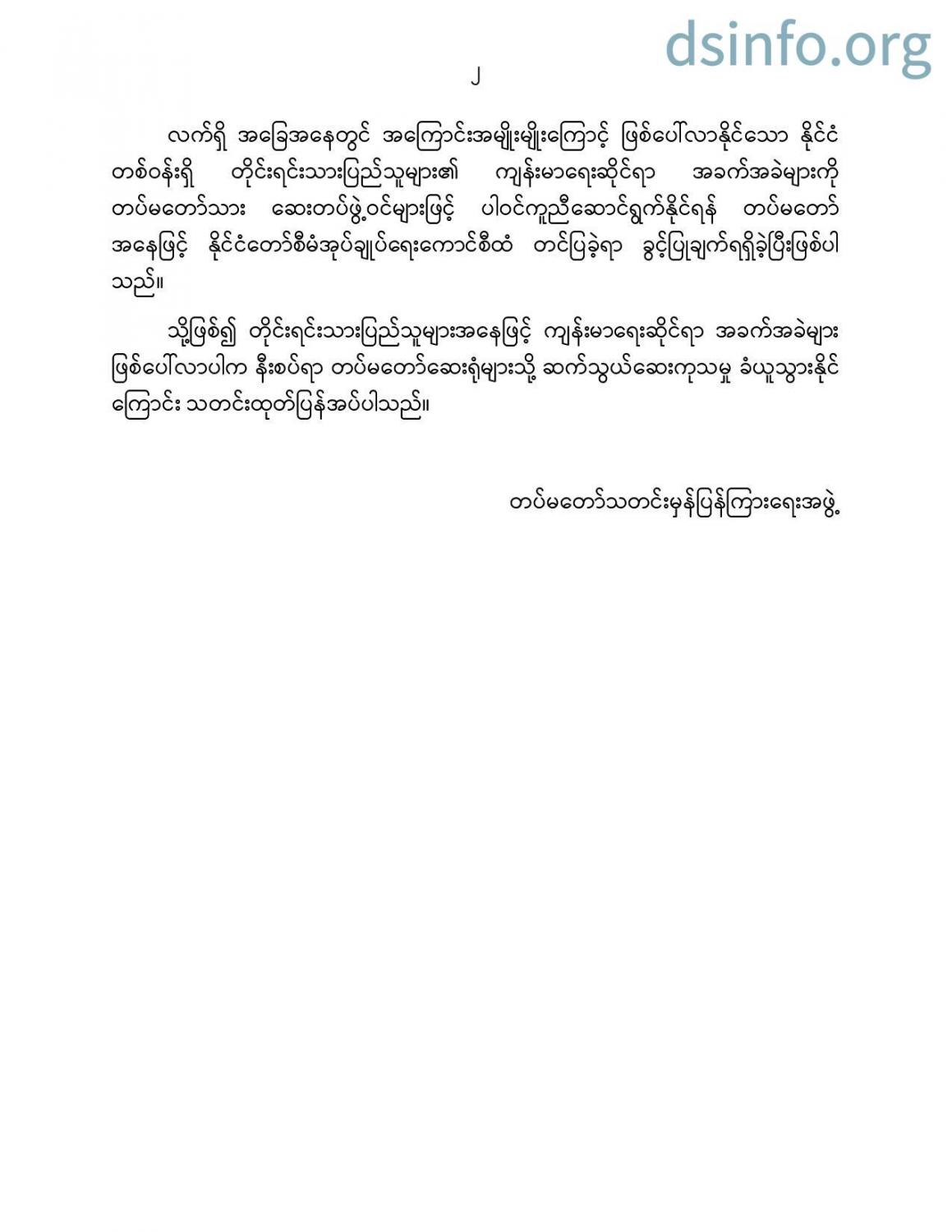 သို့ဖြစ်ပါ၍ ကျန်းမာရေးဝန်ထမ်းများအနေဖြင့် အဖျက်အမှောင့် ဆောင်ရွက်လိုသူတို့၏ နိုင်ငံနှင့် ပြည်သူ့အကျိုးကို ပျက်စီးစေသော သွေးထိုး လှုံ့ဆော်မှုများကို နားယောင်ခြင်းမပြုဘဲ စောင့်ထိန်းအပ်သော ကတိသစ္စာအရ ပြည်သူလူထုအပေါ်သာ သစ္စာစောင့်သိရန် မေတ္တာရပ်ခံ လိုပါကြောင်း။