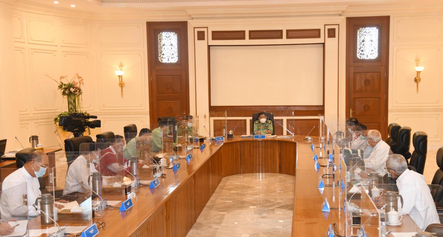 အစည်းအဝေးတွင် နိုင်ငံတော်စီမံအုပ်ချုပ်ရေး ကောင်စီဥက္ကဋ္ဌ၊ တပ်မတော် ကာကွယ်ရေးဦးစီးချုပ်က နိုင်ငံတော်တည်ငြိမ်အေးချမ်းရေး၊ တရားဥပဒေစိုးမိုးရေးနှင့် ပြည်သူလူထု၏ အသက်အိုးအိမ် စည်းစိမ်လုံခြုံရေးအတွက် တာဝန်ရှိသူများအနေဖြင့် ညင်ညင်သာသာဆောင်ရွက်လျက်ရှိကြောင်း၊ မိမိတို့ တာဝန်ယူချိန်မှစပြီး ပါတီစုံ ဒီမိုကရေစီလမ်းကြောင်းကို မပြောင်းလဲကြောင်း၊ ၂၀၀၈ ခုနှစ် ဖွဲ့စည်းပုံအခြေခံ ဥပဒေနှင့် အညီဆောင်ရွက်လျက်ရှိကြောင်း၊ နိုင်ငံရေး၊ အုပ်ချုပ်ရေး၊ စီးပွားရေး၊ လူမှုရေး၊ ငြိမ်းချမ်းရေးနှင့် နိုင်ငံတကာဆက်ဆံရေးတို့နှင့်စပ်လျဉ်း၍ မူဝါဒများပြောင်းလဲခြင်း မရှိကြောင်း၊ ပကတိအခြေအနေများသည် ရွေးကောက်ပွဲ မဲစာရင်းများမှားယွင်းမှုကြောင့် ဖြစ်ပေါ် လာခြင်းဖြစ်ကြောင်း၊ လက်ရှိအခြေအနေတွင် တိုင်းဒေသကြီး၊ ပြည်နယ်၊ ခရိုင်နှင့် မြို့နယ် တို့တွင် အရပ်ဘက်မှ အများကြည်ညိုလေးစားသည့် ပုဂ္ဂိုလ်များနှင့် ပူးပေါင်း ဆောင်ရွက်လျက်ရှိကြောင်း၊ မိမိအနေဖြင့် အရပ်ဘက်အုပ်ချုပ်ရေးကို အလေးထားကြောင်း။