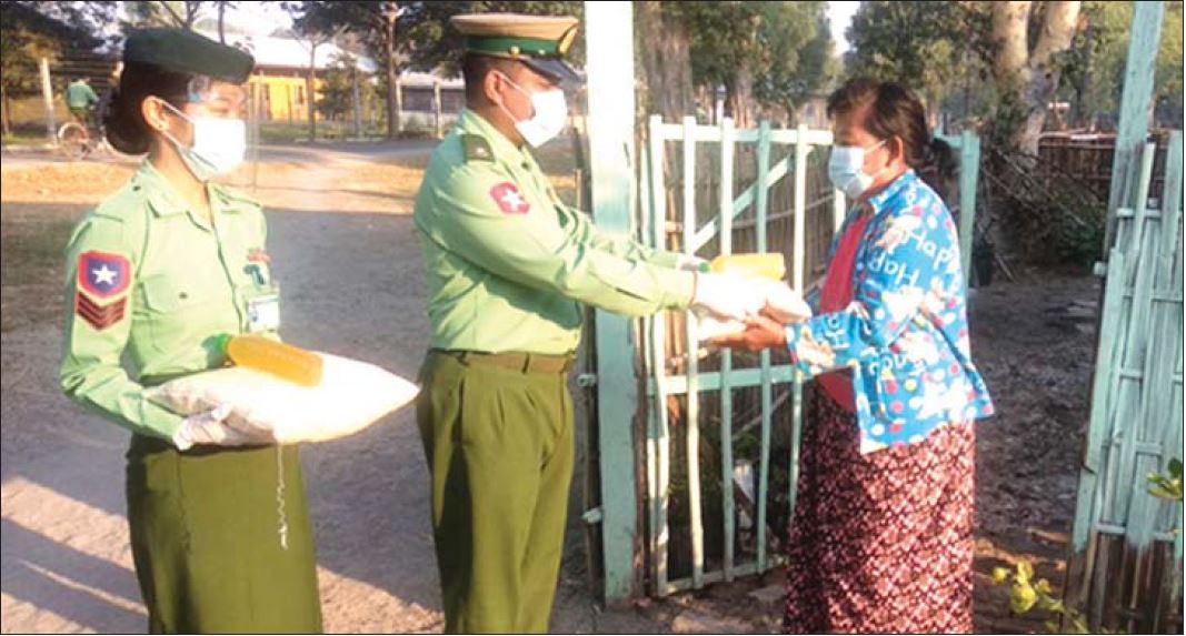 ကိုဗစ်-၁၉ ရောဂါ ကာကွယ်၊ ထိန်းချုပ်၊ ကုသမှု လုပ်ငန်းများ ဆောင်ရွက်နေစဉ် ကာလအတွင်း သွားလာမှုကန့်သတ်ချက်များကြောင့် ဒေသခံပြည်သူများ စားရေးအဆင်ပြေ စေရန်အတွက် နယ်မြေခံတပ်မတော် သားများက ဆန်၊ ဆီနှင့် စားသောက်ဖွယ်ရာများကို အိမ်အရောက် လိုက်လံ ပေးဝေလှူဒါန်းလျက်ရှိသည်။