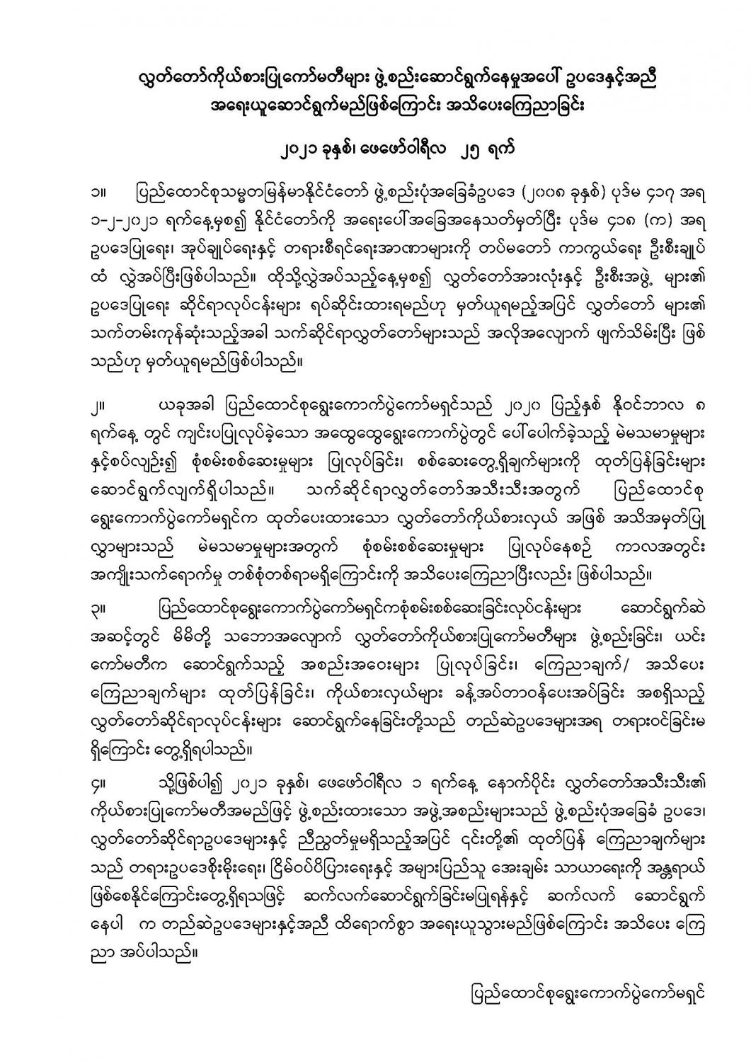 လွှတ်တော်ကိုယ်စားပြုကော်မတီများ ဖွဲ့စည်းဆောင်ရွက်နေမှုအပေါ် ဥပဒေနှင့်အညီ အရေးယူဆောင်ရွက်မည်ဖြစ်ကြောင်း အသိပေးကြေညာခြင်း