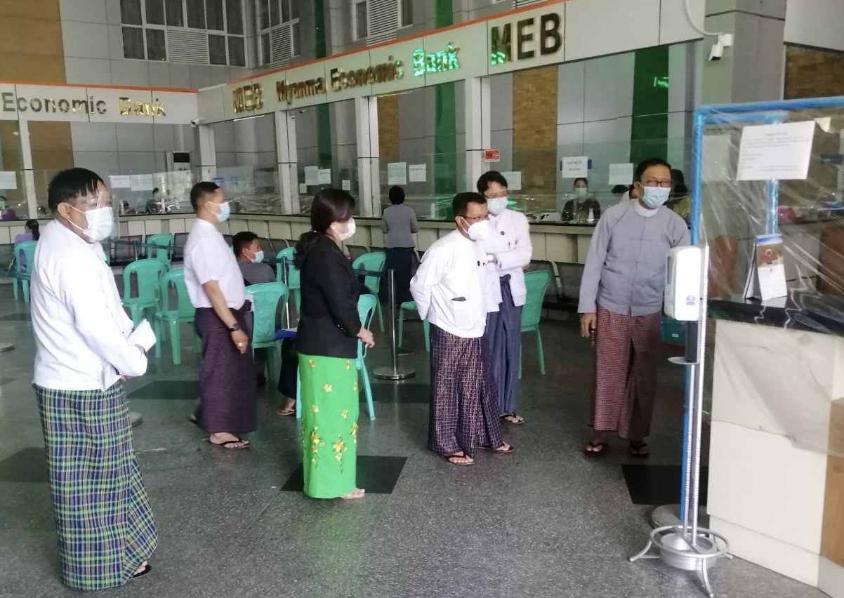 စီမံကိန်း၊ ဘဏ္ဍာရေးနှင့် စက်မှုဝန်ကြီးဌာန ပြည်ထောင်စုဝန်ကြီး ဦးဝင်းရှိန်သည် ယနေ့ နံနက် ၉ နာရီ တွင် နေပြည်တော်ရှိ မြန်မာ့စီးပွားရေးဘဏ် (ရုံးချုပ်) သို့ သွားရောက်၍ ငွေသွင်း/ ငွေထုတ် ဆောင်ရွက်နေမှုများ၊ အစိုးရဌာနအဖွဲ့အစည်းများသို့ လစာထုတ်ပေးနေမှုများနှင့် ဘဏ်လုပ်ငန်း ဆောင်ရွက်နေမှုများကို ကြည့်ရှုစစ်ဆေး၍ ဘဏ်မှ ဦးဆောင်ညွှန်ကြားရေးမှူး၊ အထွေထွေမန်နေဂျာများ၊ မန်နေဂျာများနှင့် ဝန်ထမ်းများအား တွေ့ဆုံသည်။