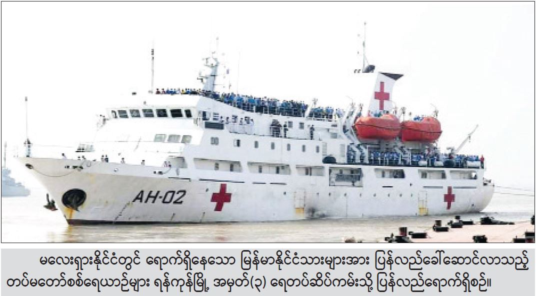 မြန်မာ့တပ်မတော်မှ စစ်ရေယာဉ်သုံးစင်းသည် မလေးရှားနိုင်ငံလူမွတ် (Lumut) ရေတပ် ဆိပ်ကမ်းသို့ ဖေဖော်ဝါရီ ၂၁ ရက် နံနက်ပိုင်းတွင်ရောက်ရှိခဲ့ပြီး ဖေဖော်ဝါရီ ၂၃ ရက်တွင် မြန်မာနိုင်ငံသား ၁၀၈၆ ဦးအား မလေးရှားနိုင်ငံ တာဝန်ရှိသူများထံမှ စနစ်တကျ လွှဲပြောင်း လက်ခံရယူပြီး လိုအပ်သည့် ကျန်းမာရေးစစ်ဆေးပေးခြင်း၊ အဝတ်အစား အသုံးအဆောင်များ ထောက်ပံ့ပေးခြင်းများ ဆောင်ရွက်ပြီး မြန်မာနိုင်ငံသို့ ပြန်လည်ထွက်ခွာခဲ့ကာ လမ်းခရီးစဉ် တစ်လျှောက်တွင်လည်း လုံခြုံရေး၊ စားသောက် နေထိုင်ရေးနှင့် လိုအပ်သော ကျန်းမာရေး စောင့်ရှောက်မှုလုပ်ငန်းများကို ဆောင်ရွက် ပေးခဲ့သည်။